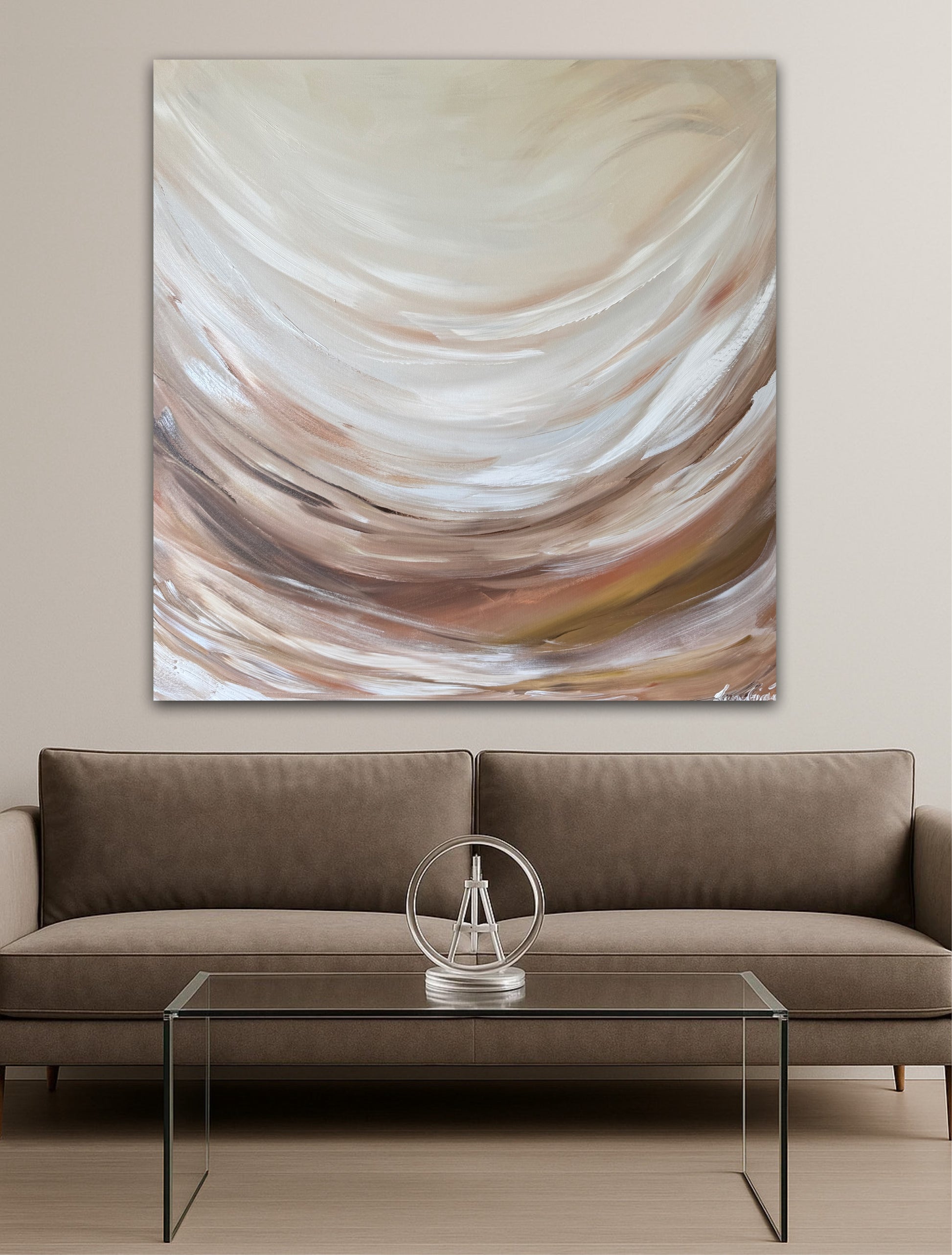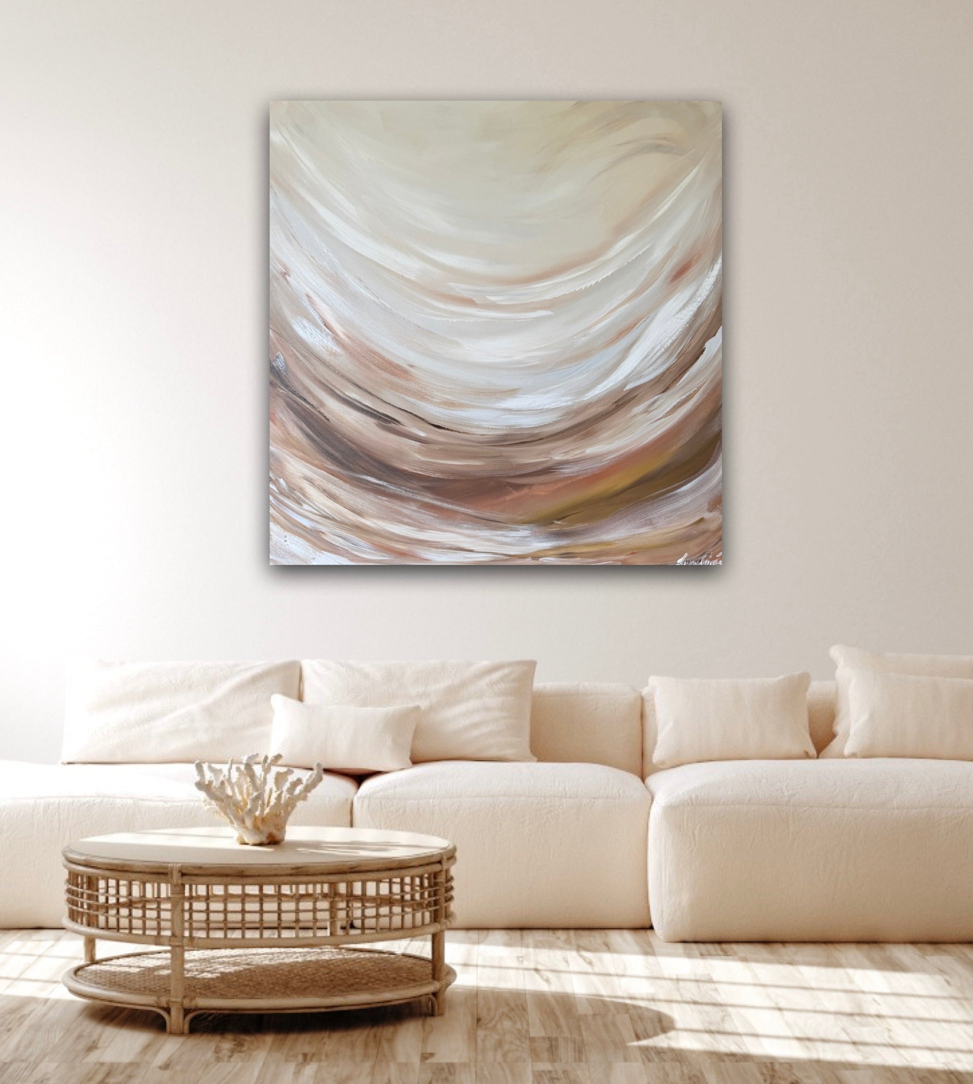 The movement feels like gentle waves or shifting sand dunes, creating a calming, grounding energy. The blending is velvety and seamless, giving the artwork a soothing, airy feel that instantly warms any space.