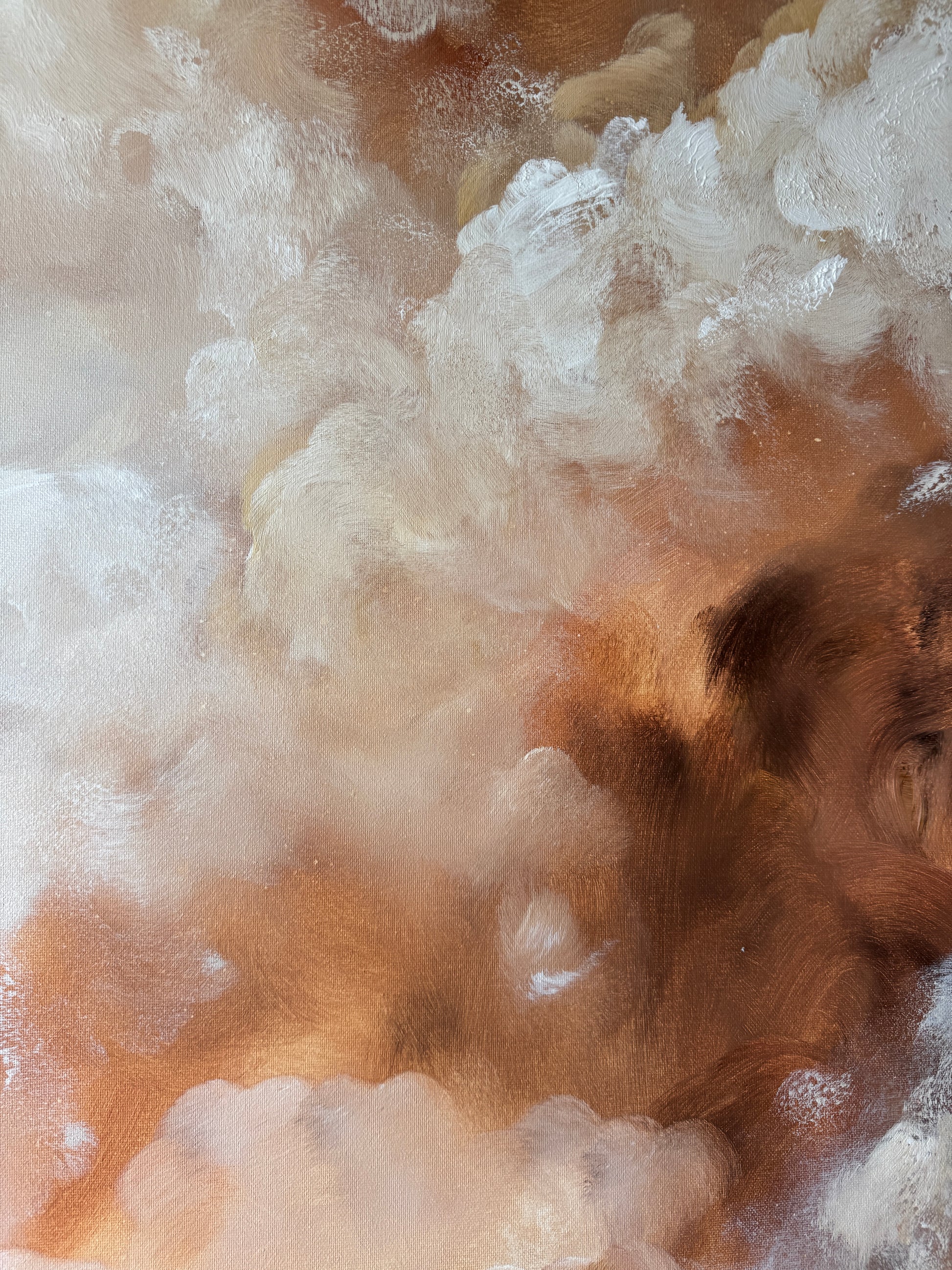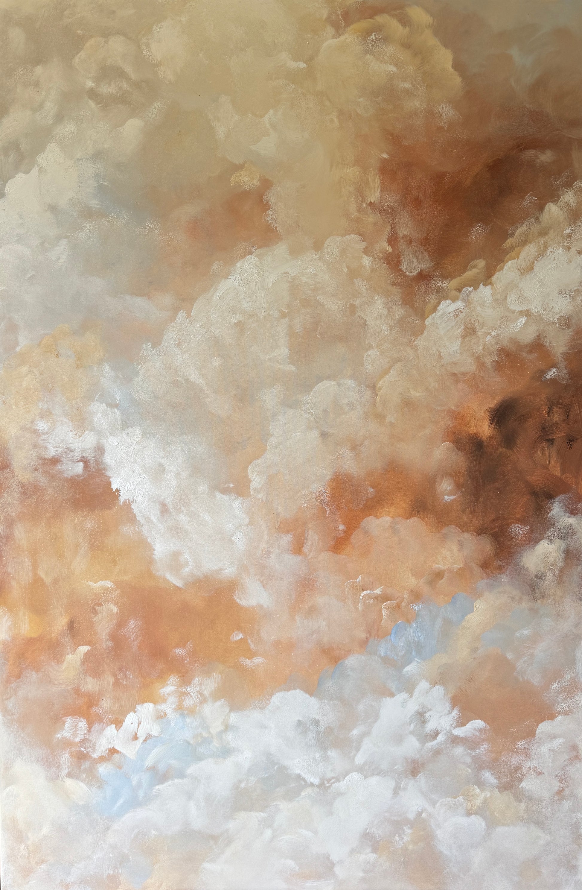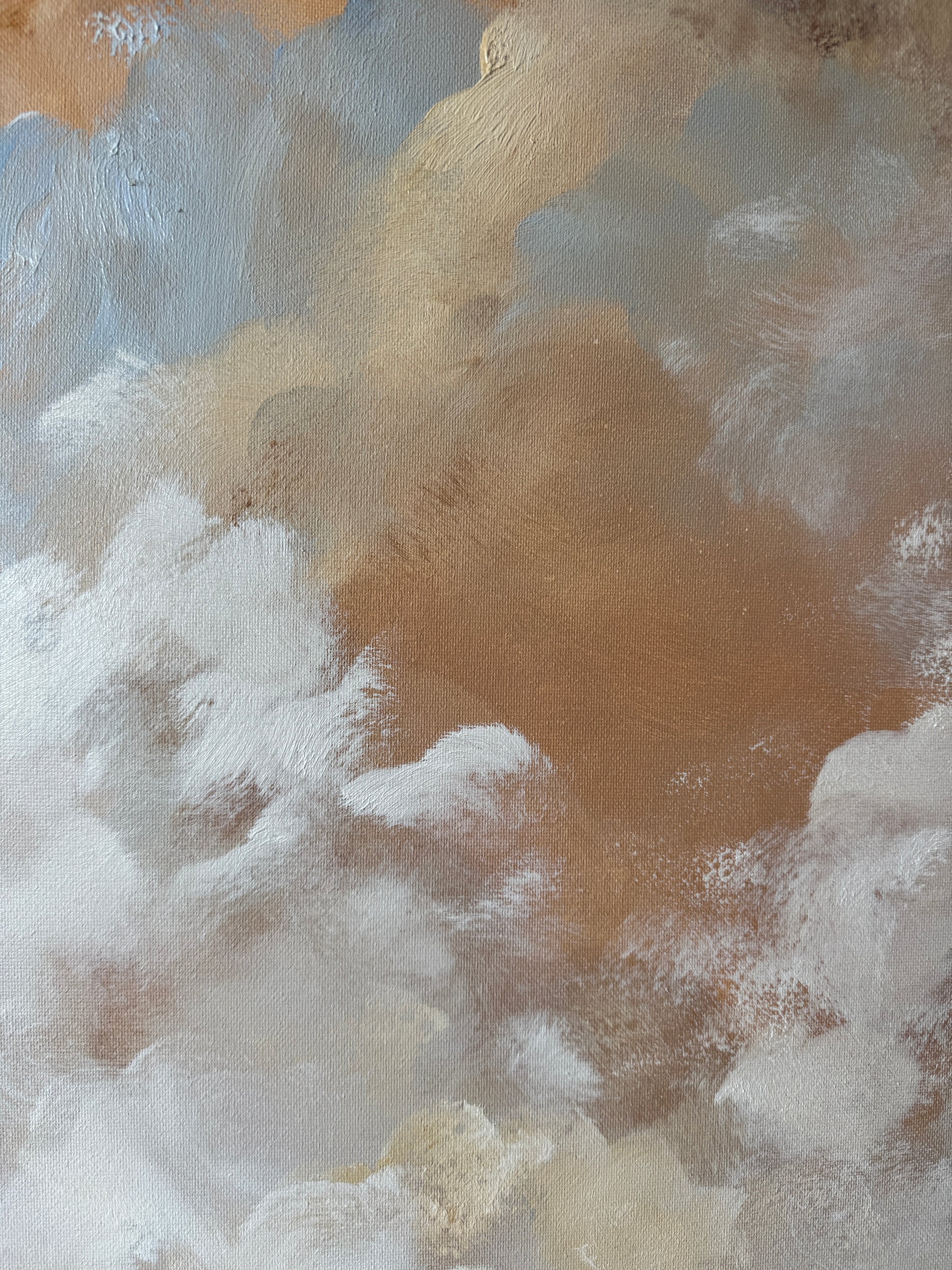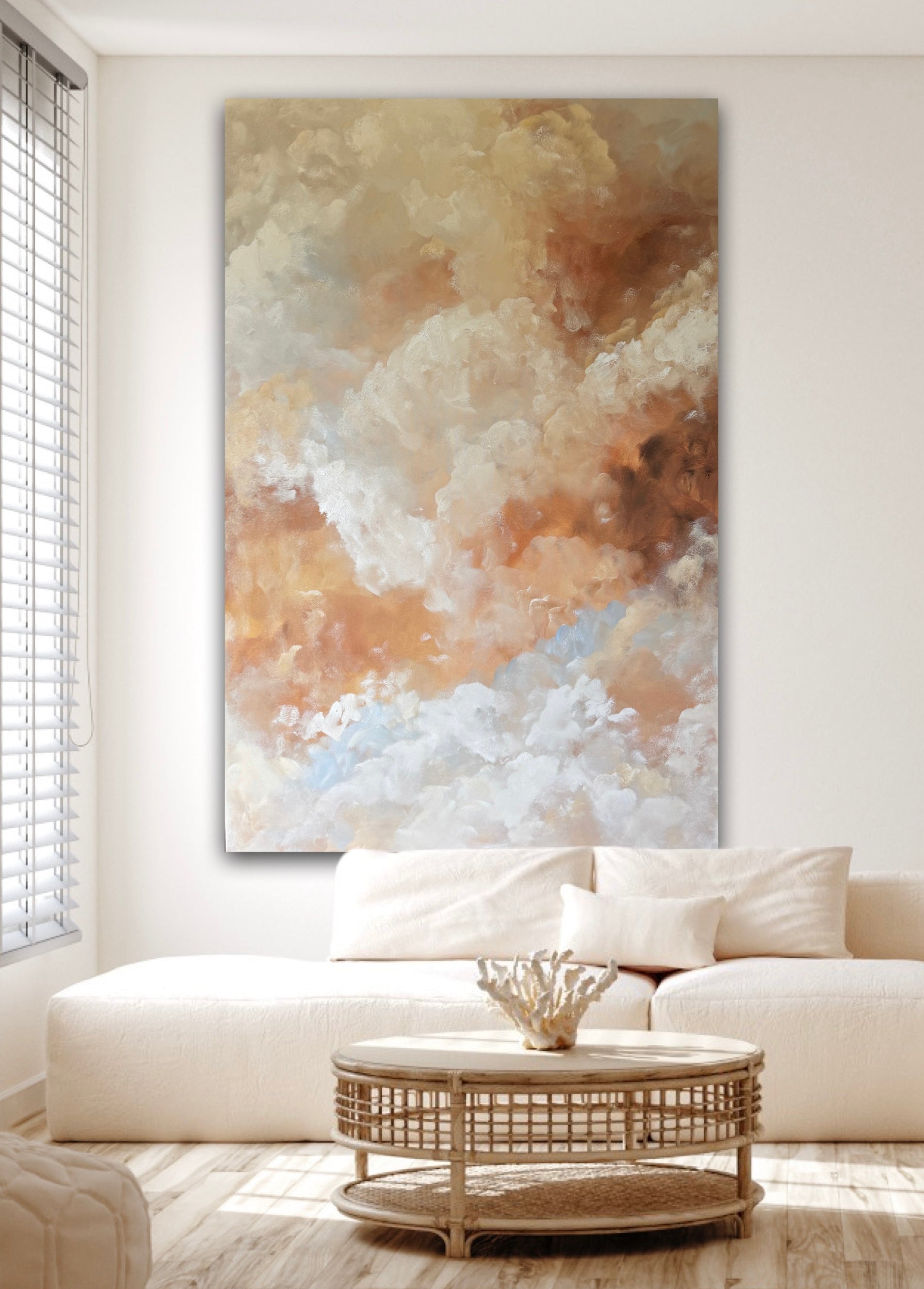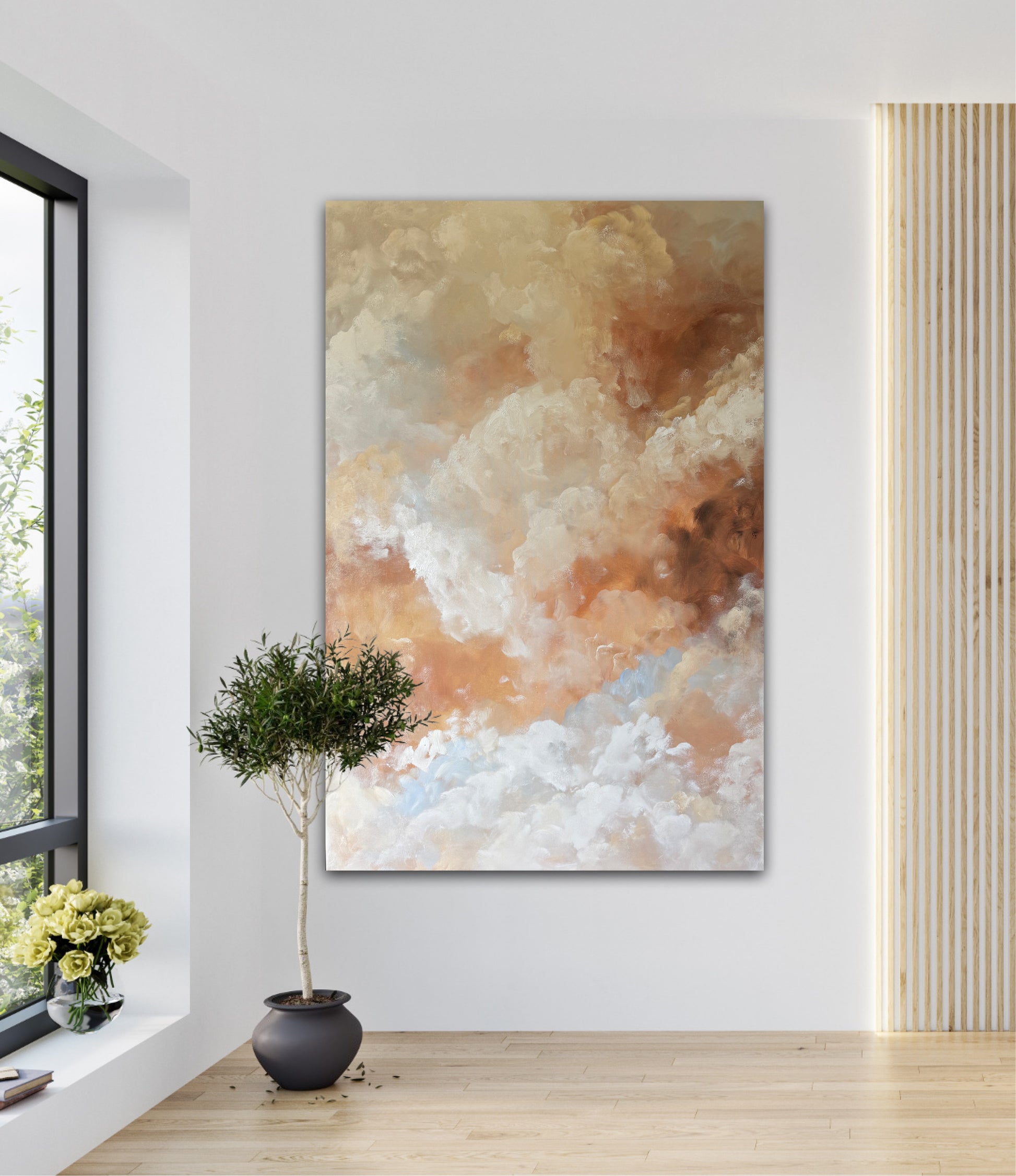 A soft, atmospheric abstract piece that blends warm earthen tones with gentle, luminous highlights. Hints of caramel, sand and muted sky blues melt into each other forming a dreamy horizon that feels both grounding and calm.