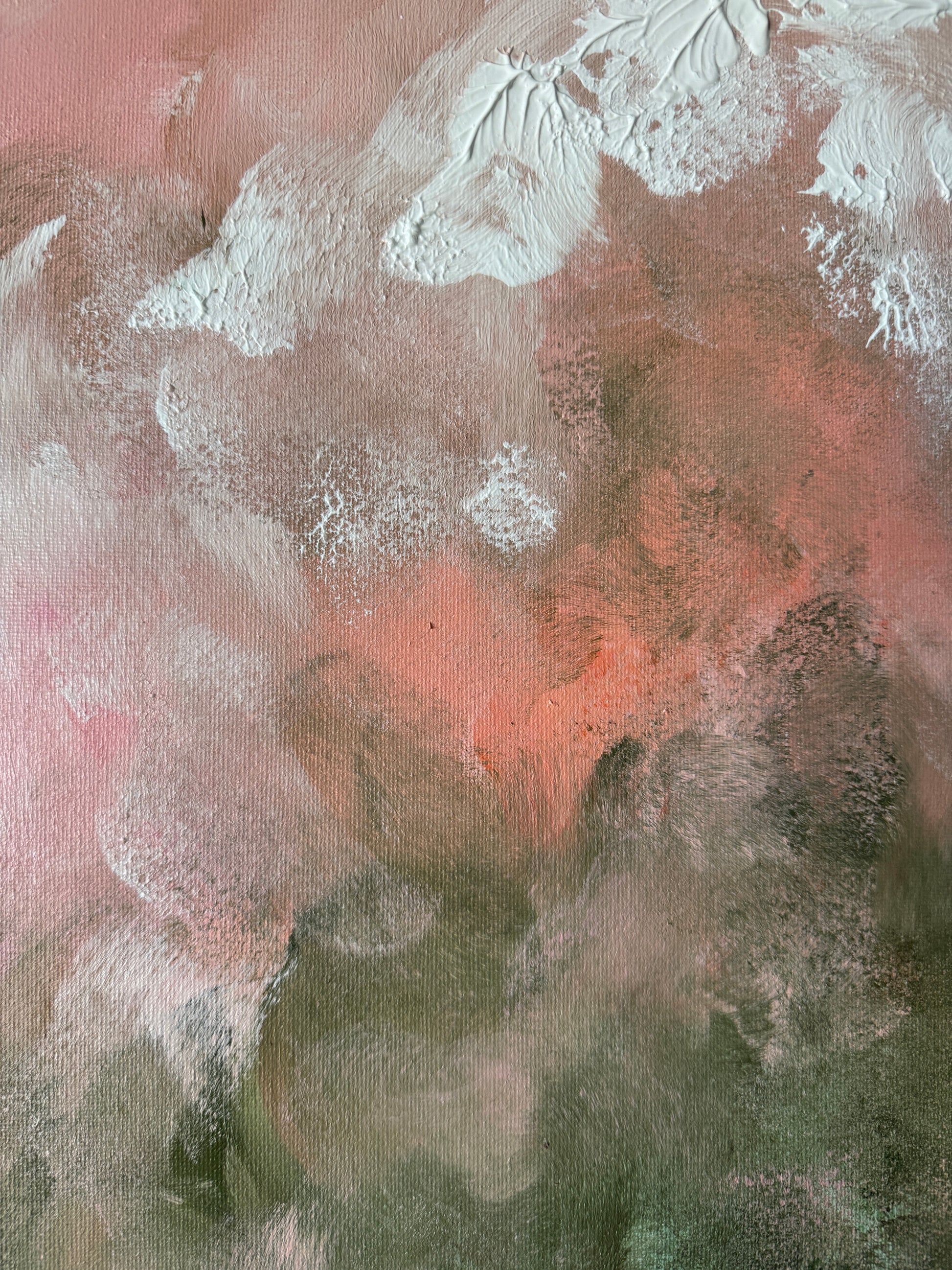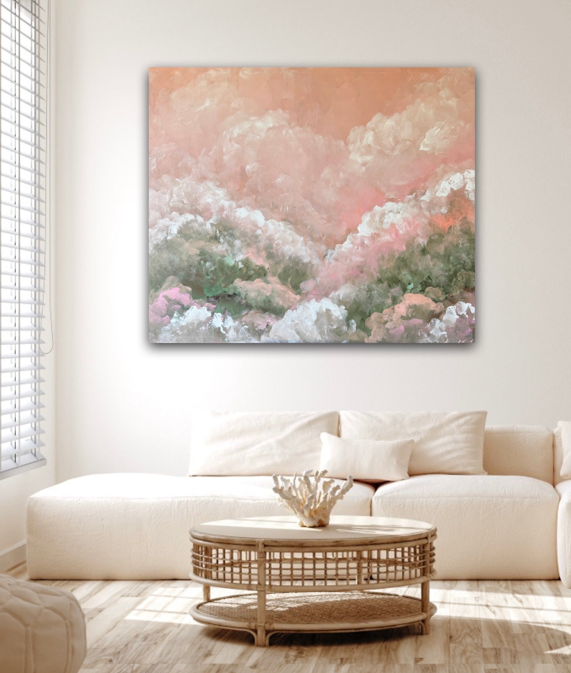 Gentle peach, blush pink and ivory tones blend seamlessly with muted greens creating a sense of harmony and serenity. The texture mimics billowing clouds, offering both softness and depth as though nature and the sky are merging into one dreamlike landscape.