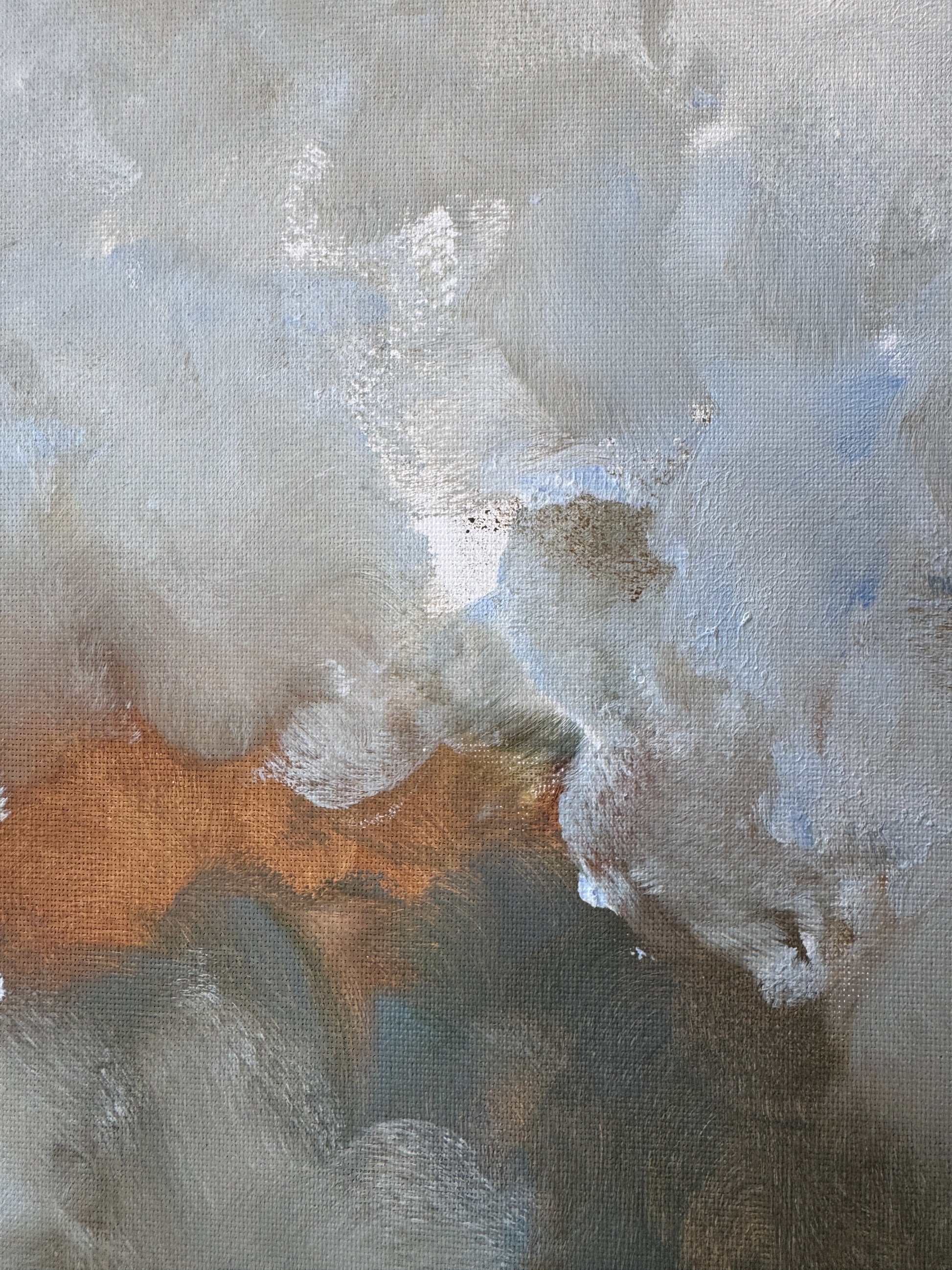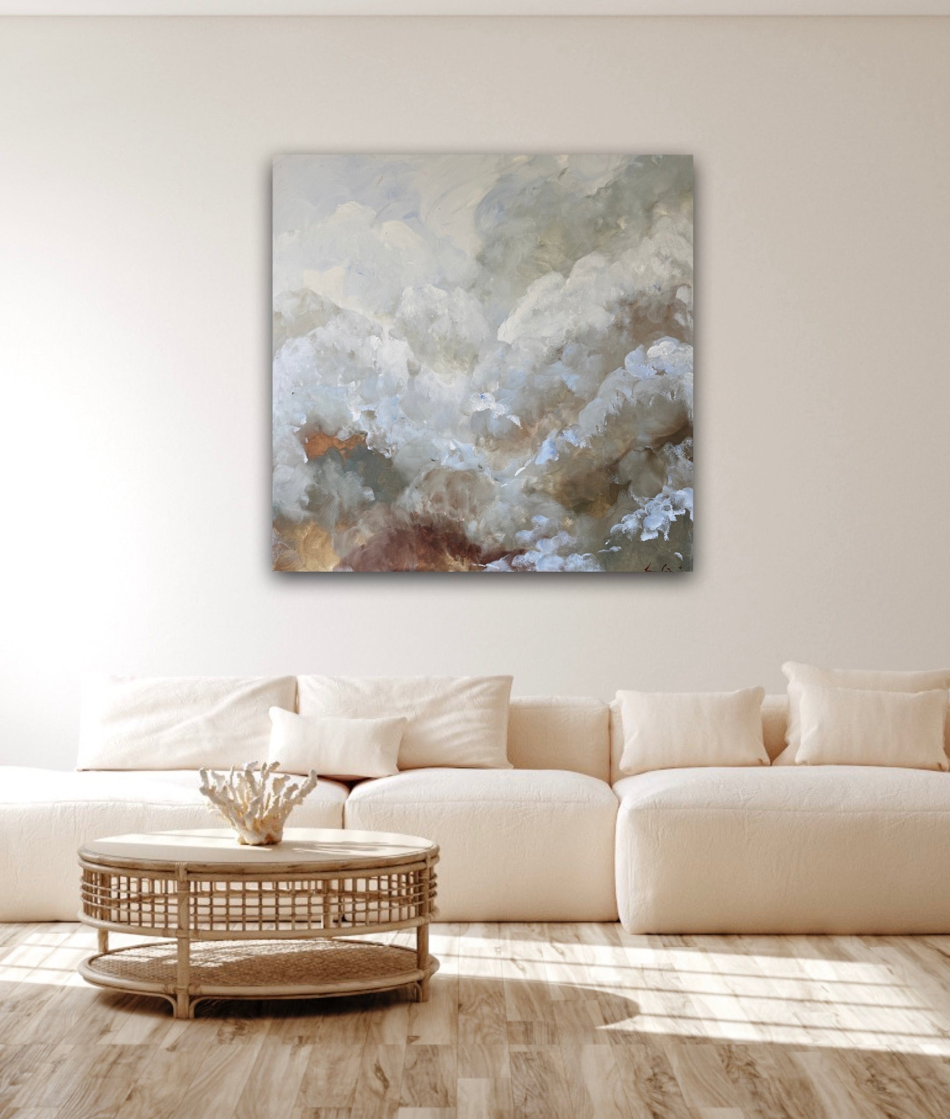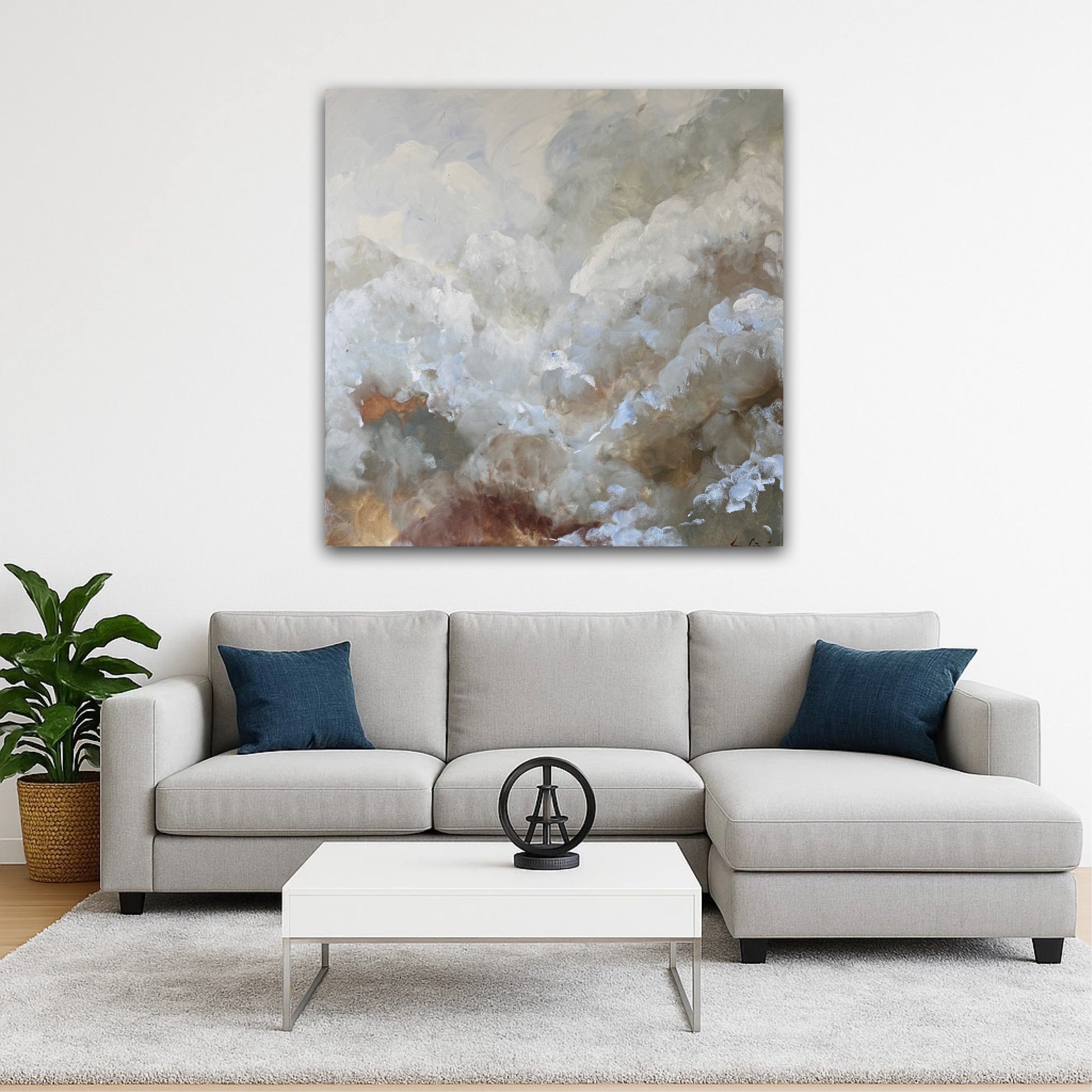 This piece captures the quite drama of shifting skies and rolling landscapes, where soft clouds of white and grey meet grounding earthy tones. Both calming and powerful, it invites us to pause and feel immersed in the beauty of in-between moments.
