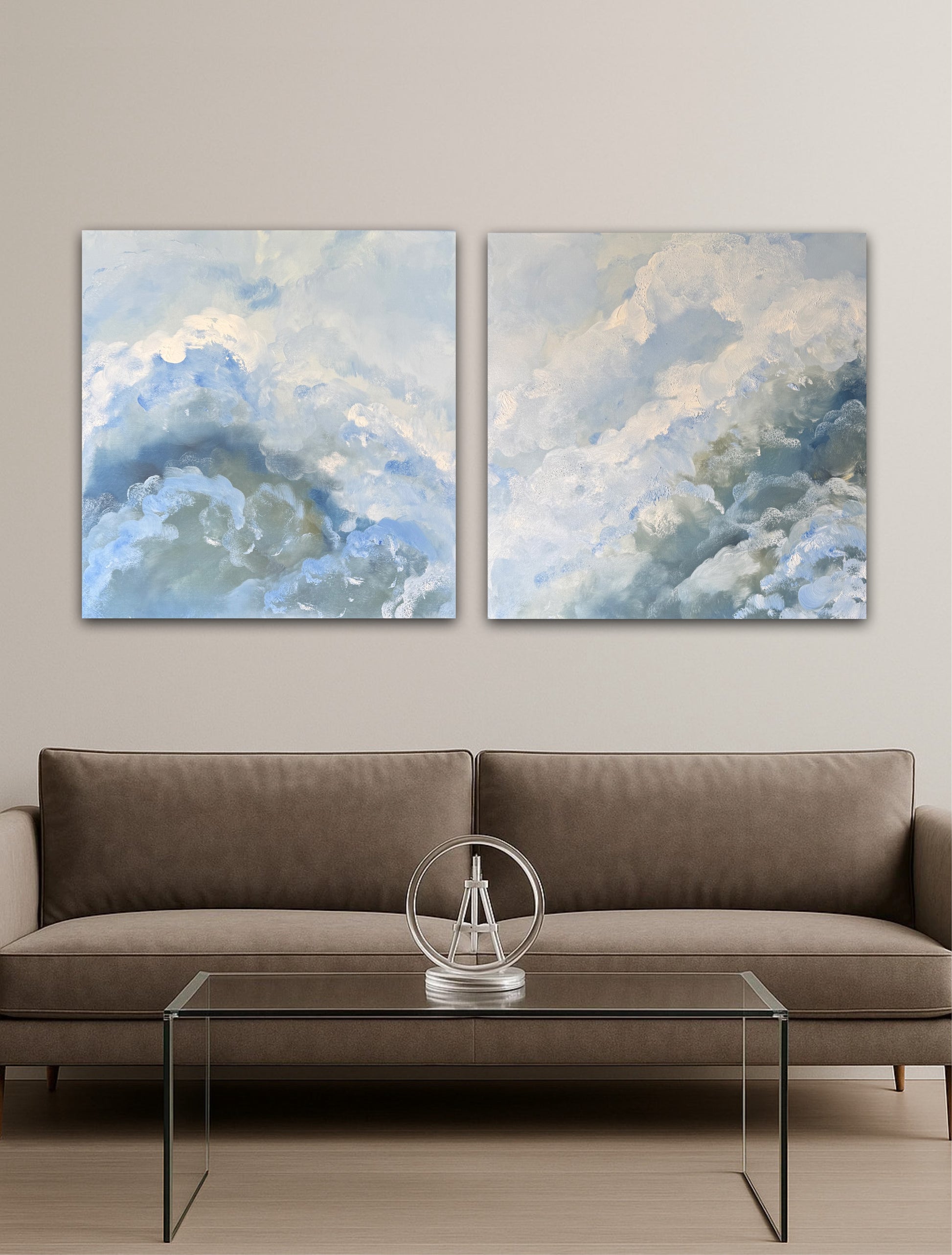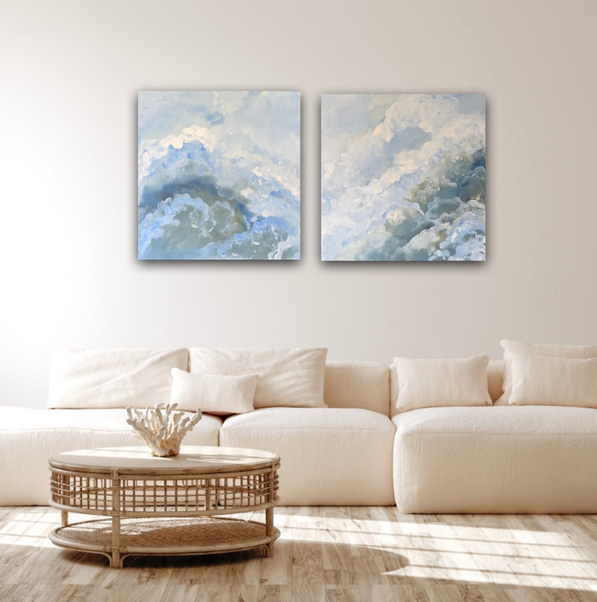 A serene diptych featuring soft blue, seafoam and cloud-like hues. The two pieces flow together like rolling waves, creating movement and tranquility. Perfect for adding light and calmness to any space.