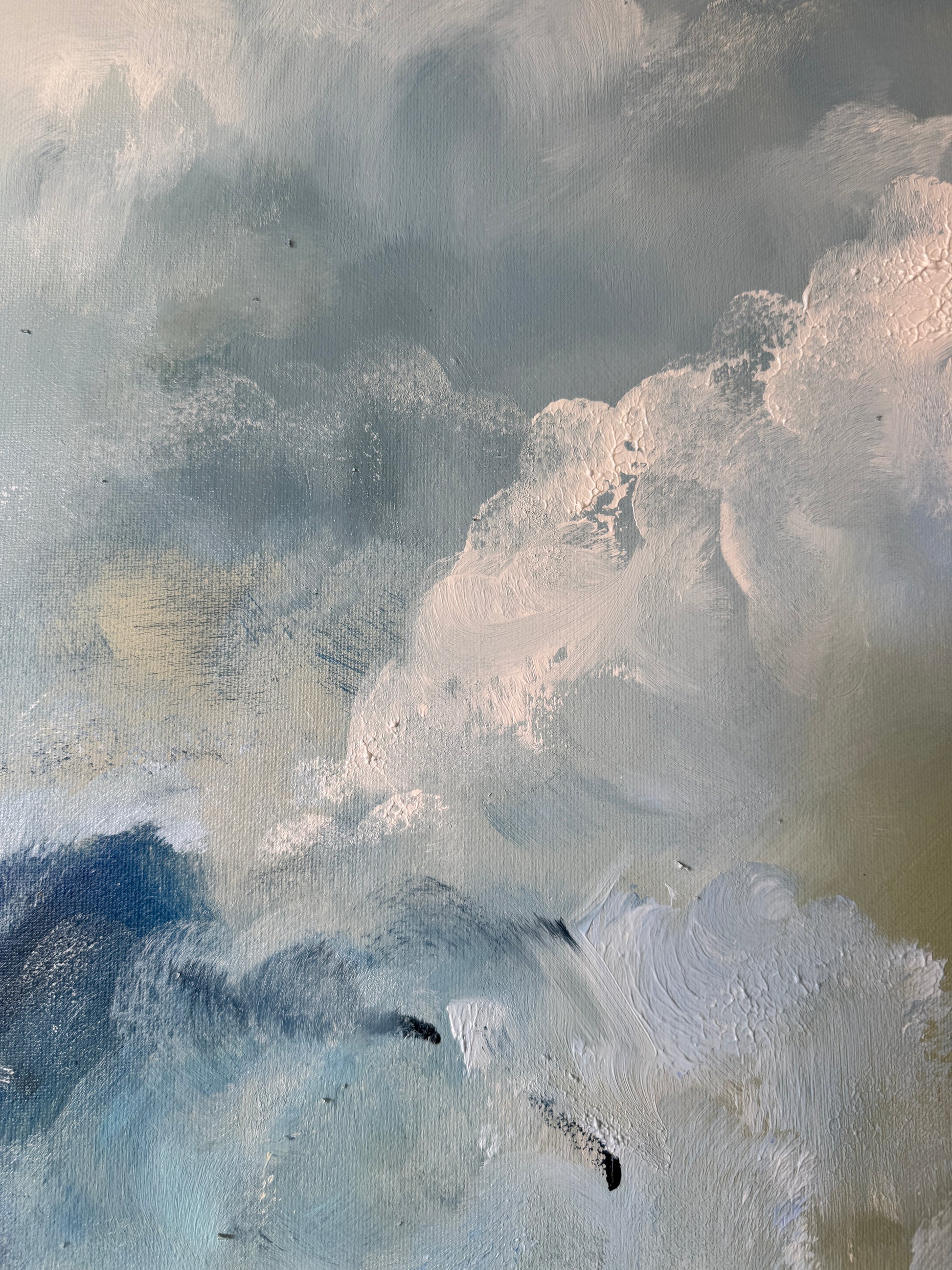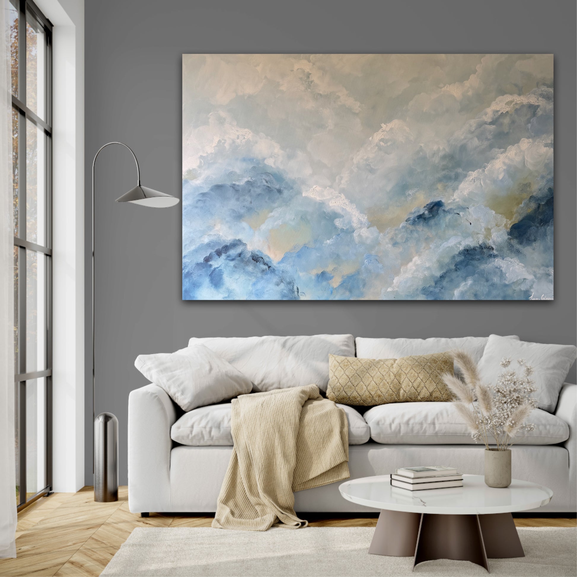 Calming blends of blue and neutral tones create a soft, atmospheric mood that complements modern, minimalist interiors. Light, airy and serene, this artwork brings a sense of space and tranquility to any room.