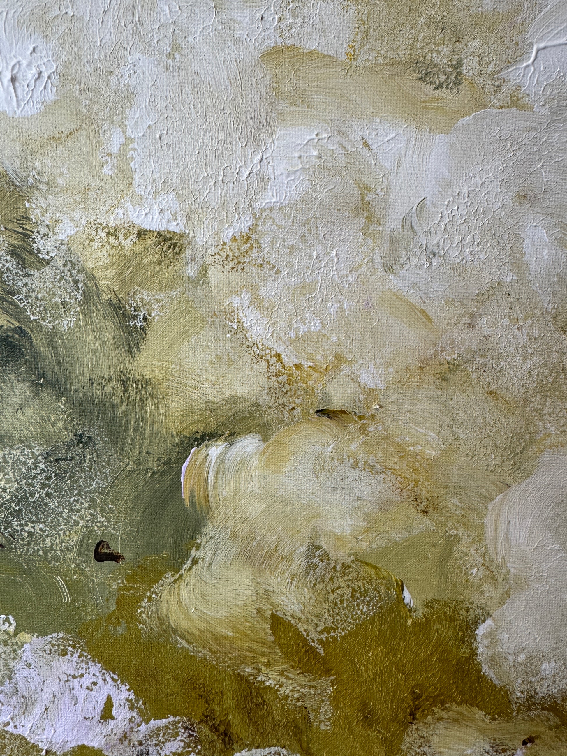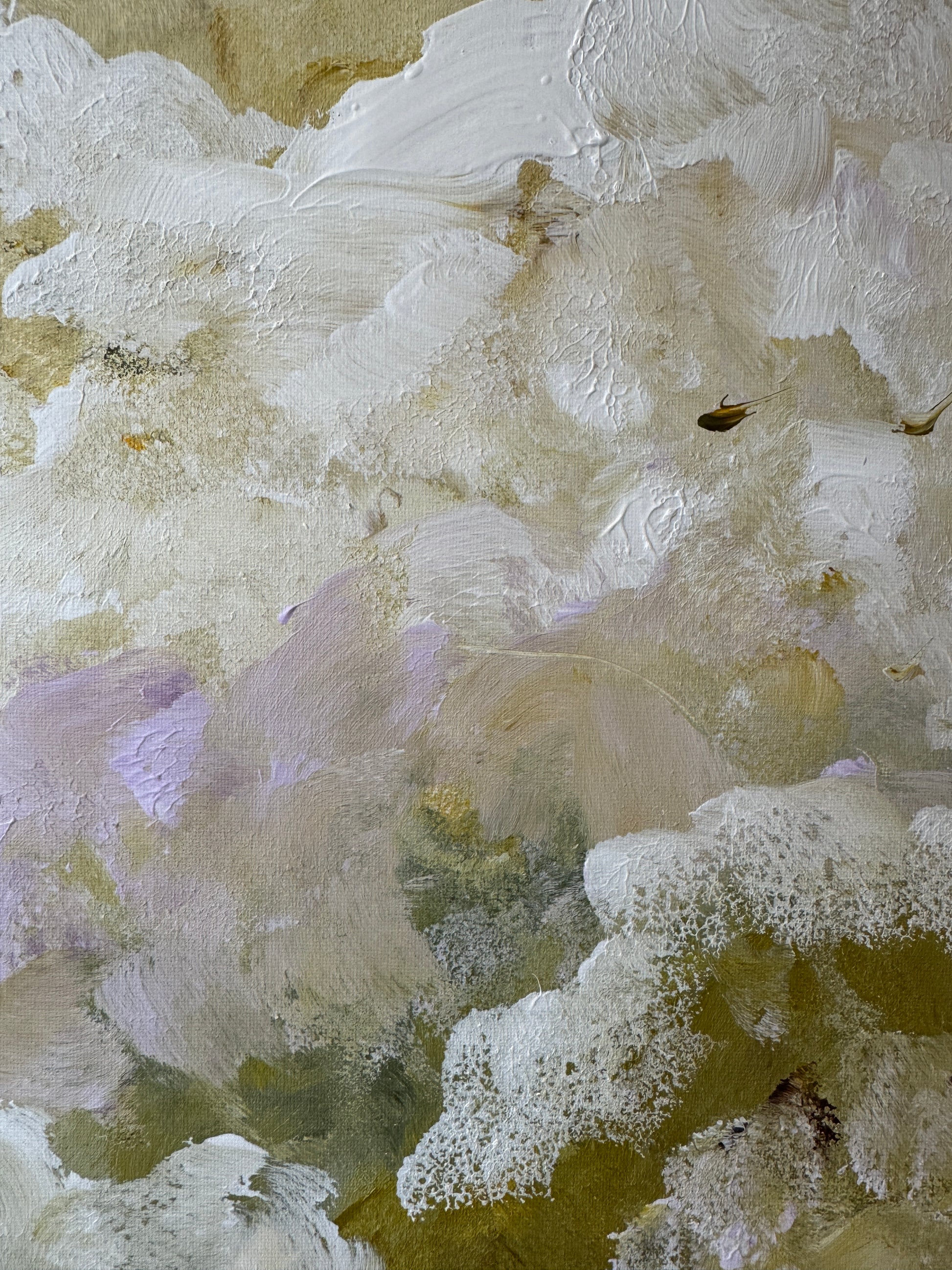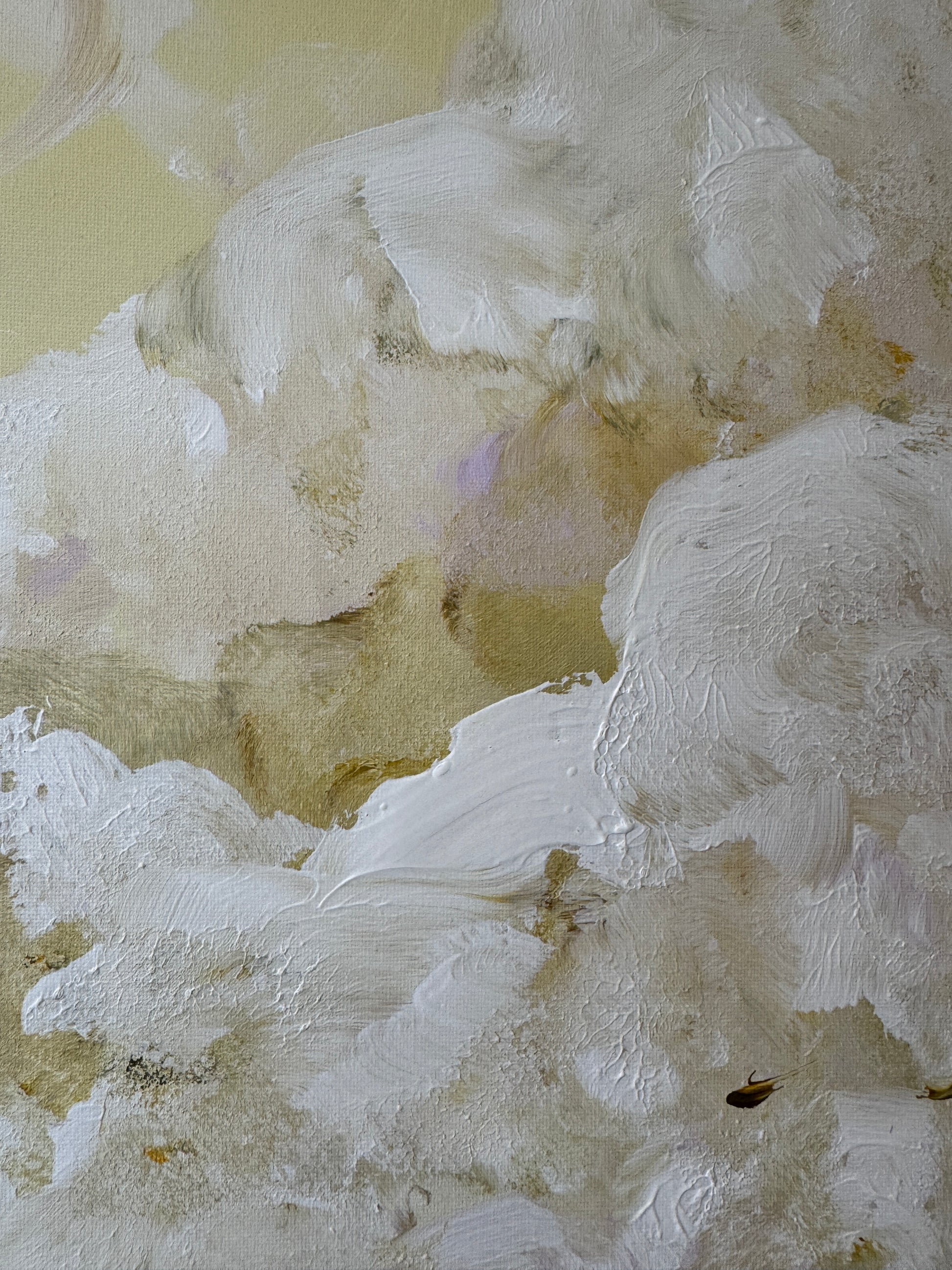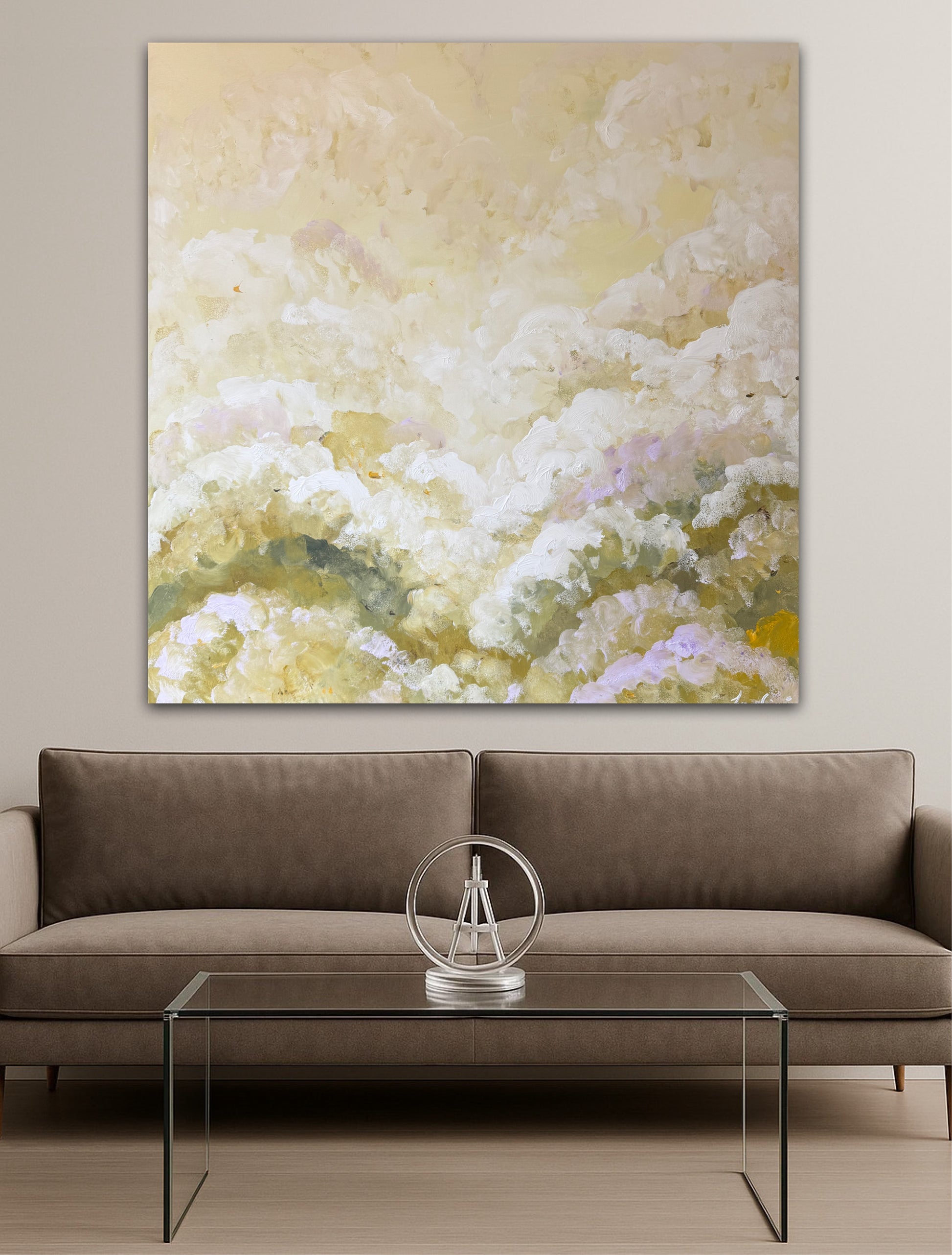 A soft and luminous abstract that captures the feeling of clouds drifting over rolling landscapes. The textured strokes bring depth and movement while the palette keeps the piece light and harmonious. Perfect for adding warmth and serenity to any interior.