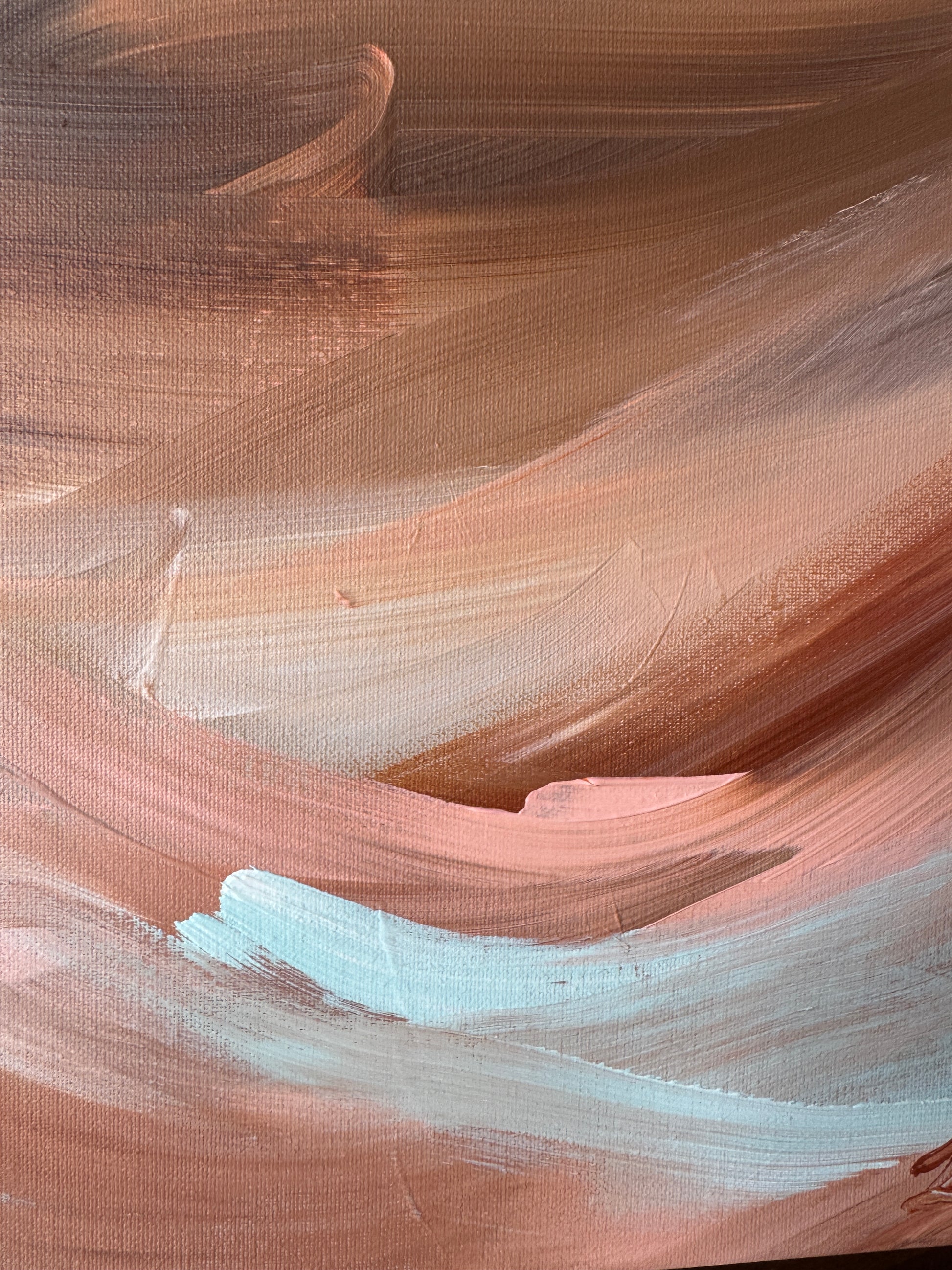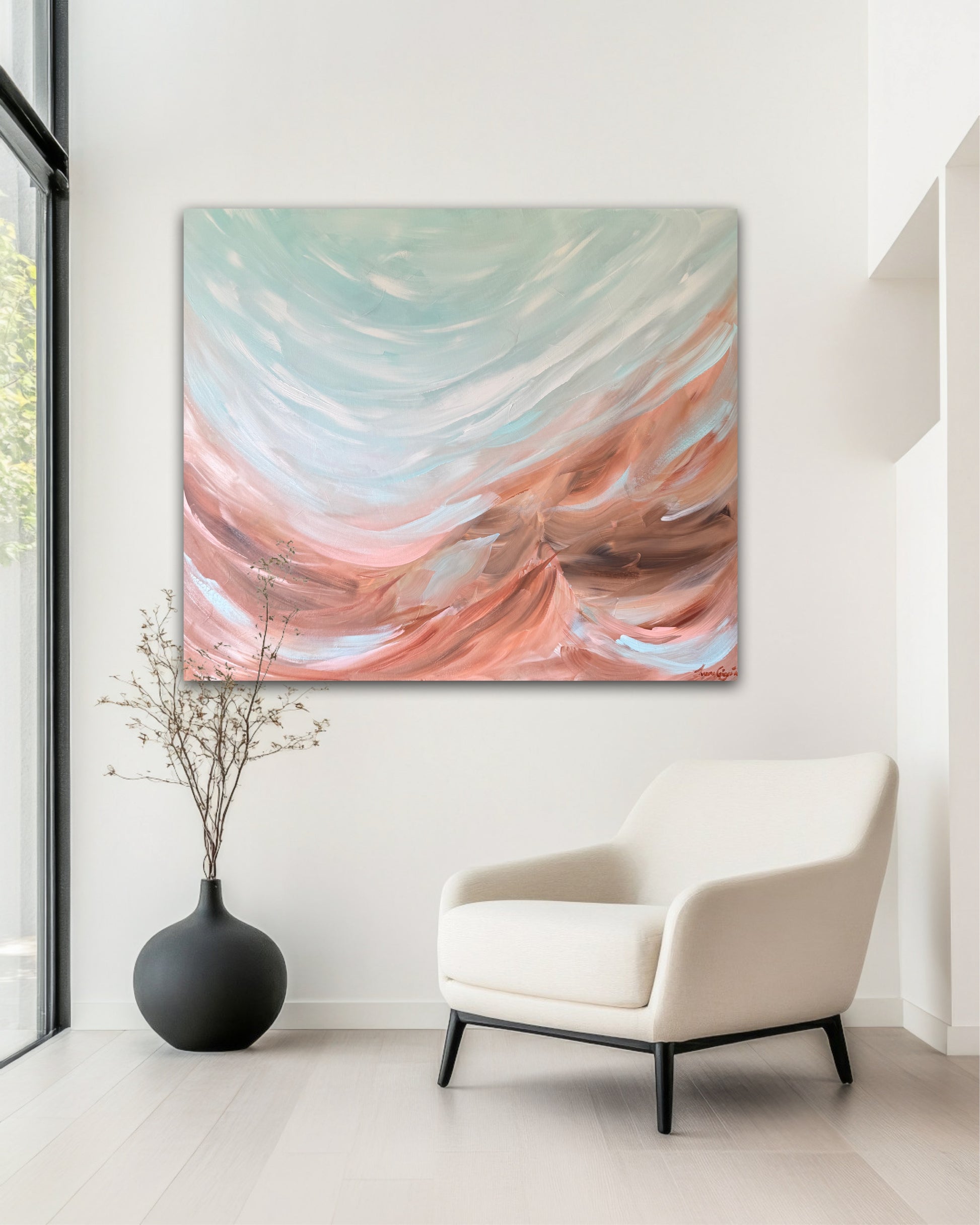 'Dream Tide' is a calm and serene artwork, where soft teal blues meet warm peach and brown tones in a gentle dance across the canvas. It brings a balance and beauty to any space, a grounding yet uplifting presence.