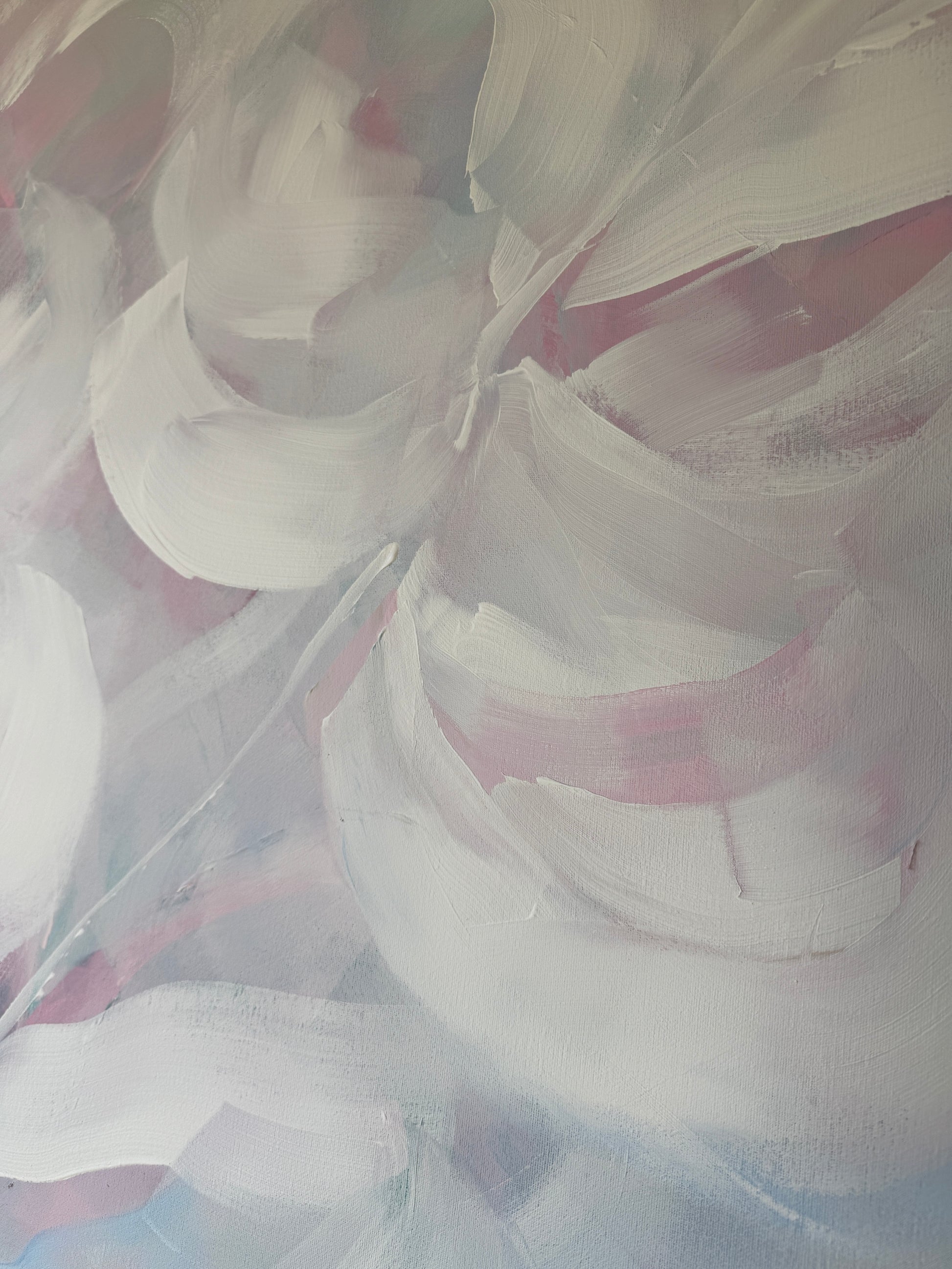 A soft, dreamy abstract blending blush pinks, creams and delicate blues into feather like strokes that feel weightless and calm.