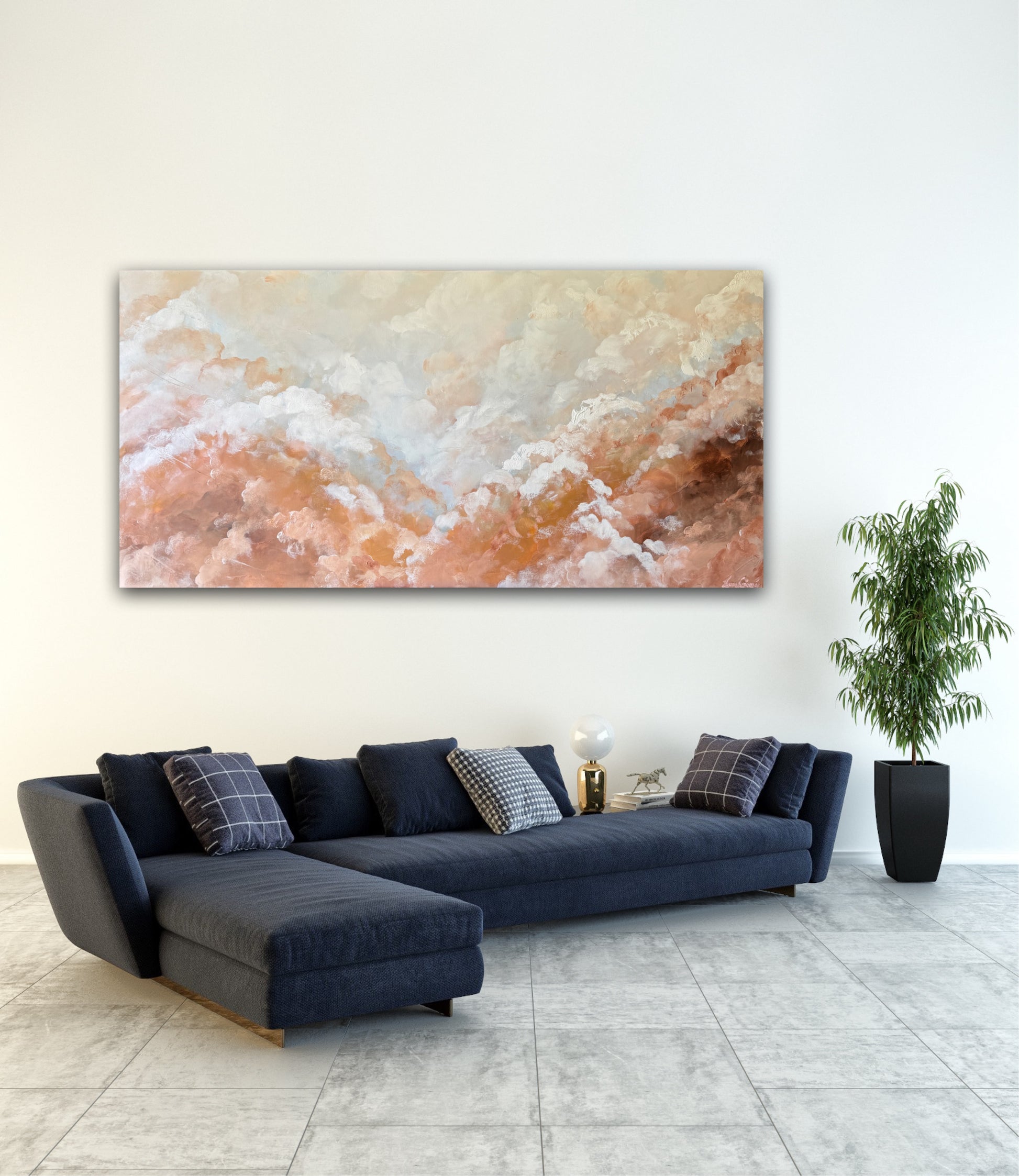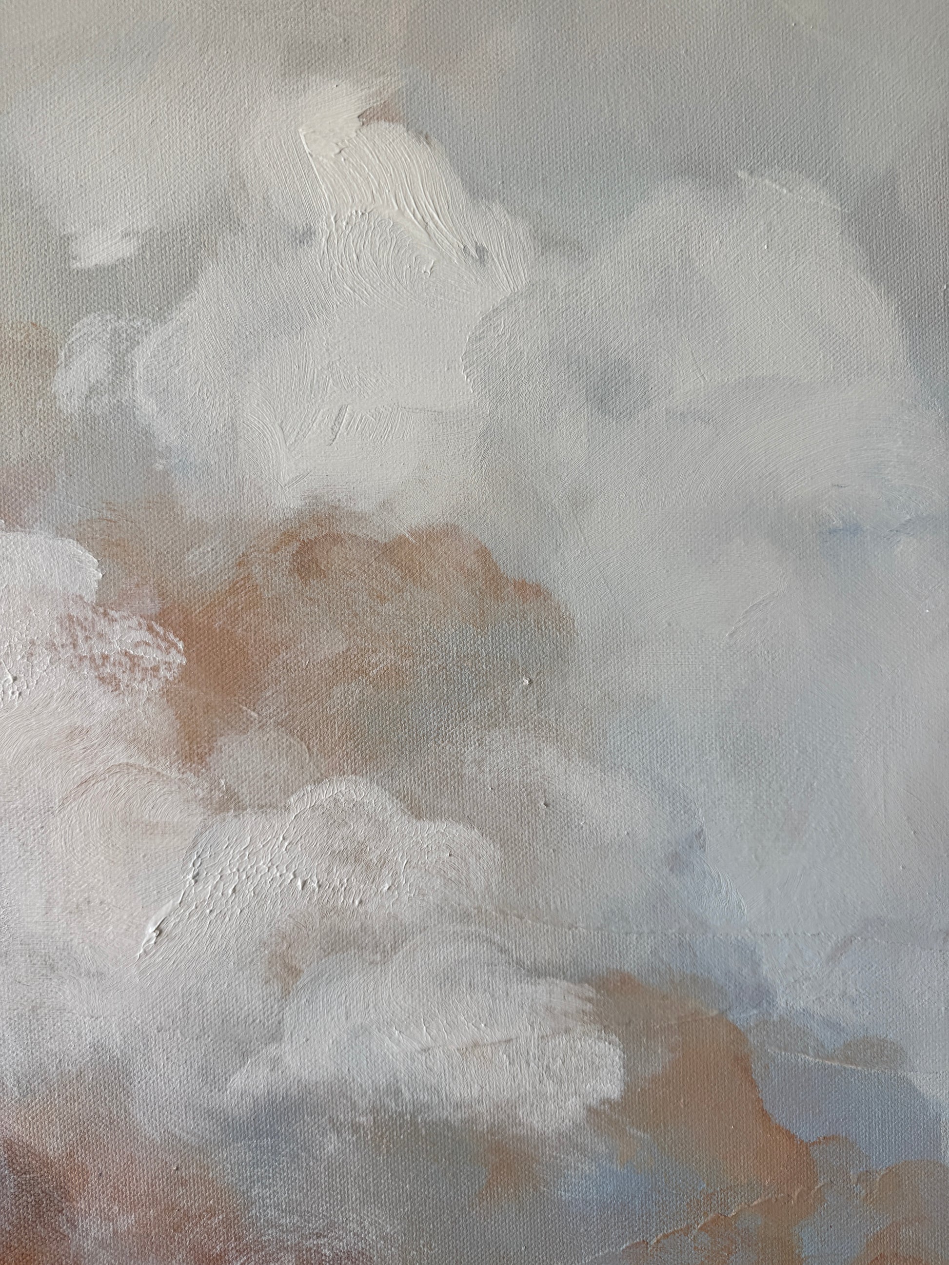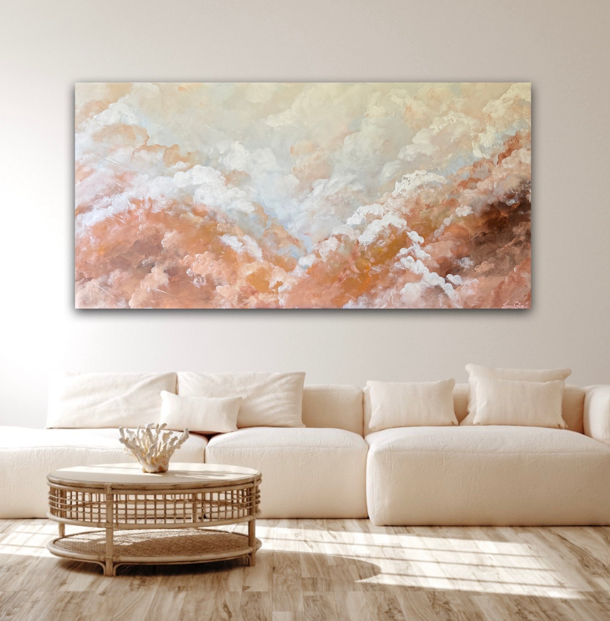Layers of cloud like forms drift across the canvas in muted apricot, sand and gentle white tones create a sense of quiet depth and openness. It invites us to slow down, breathe and settle into the space.