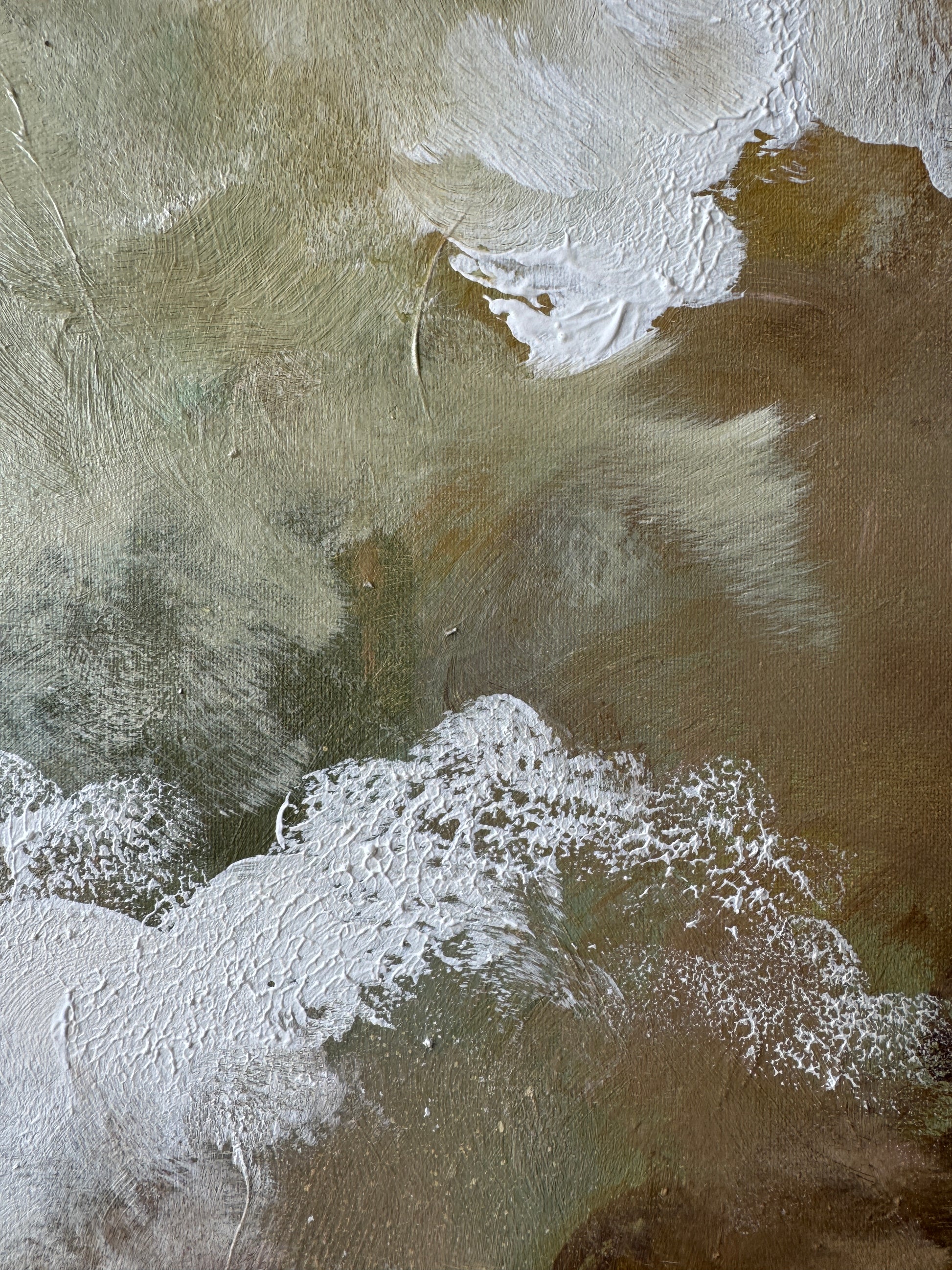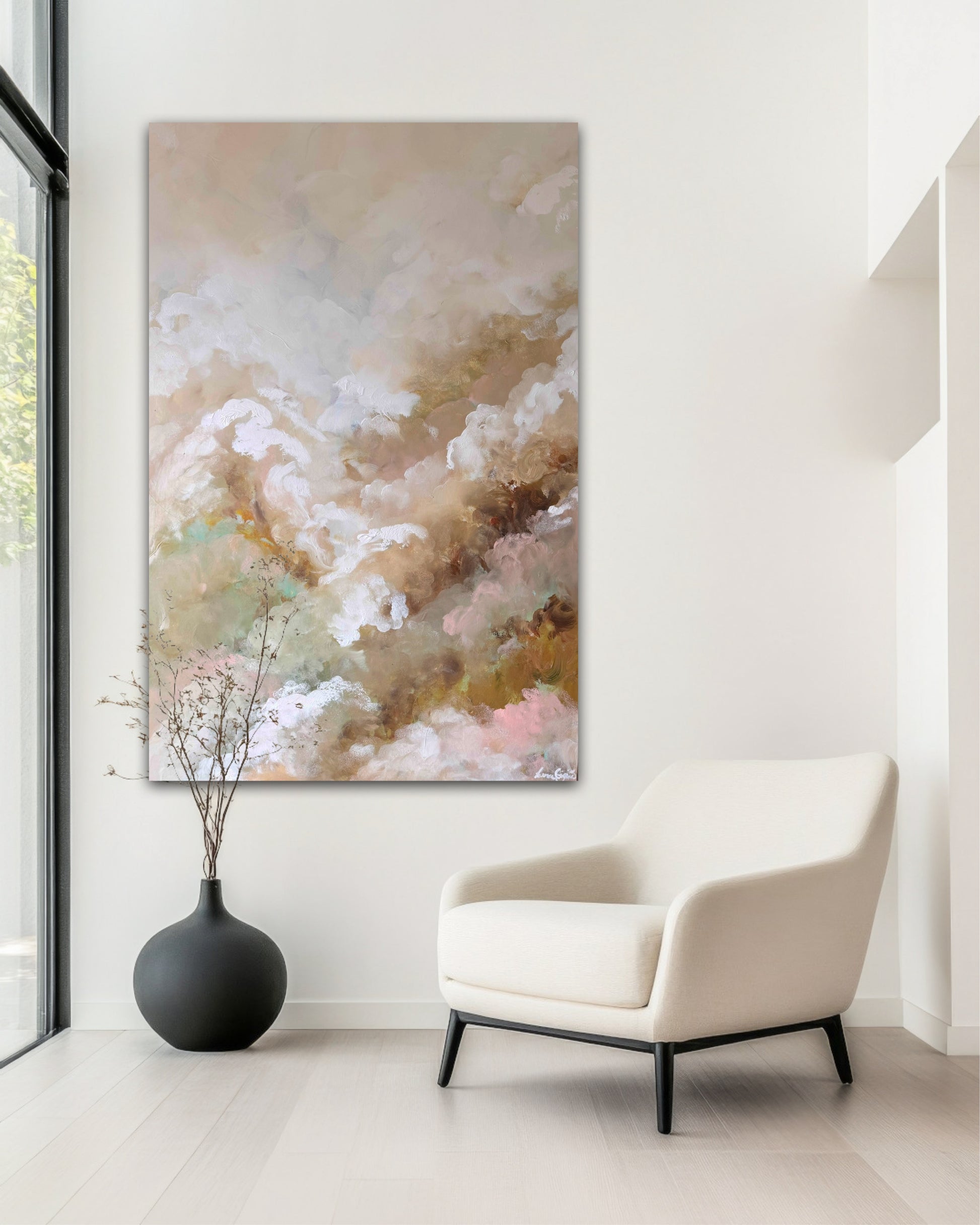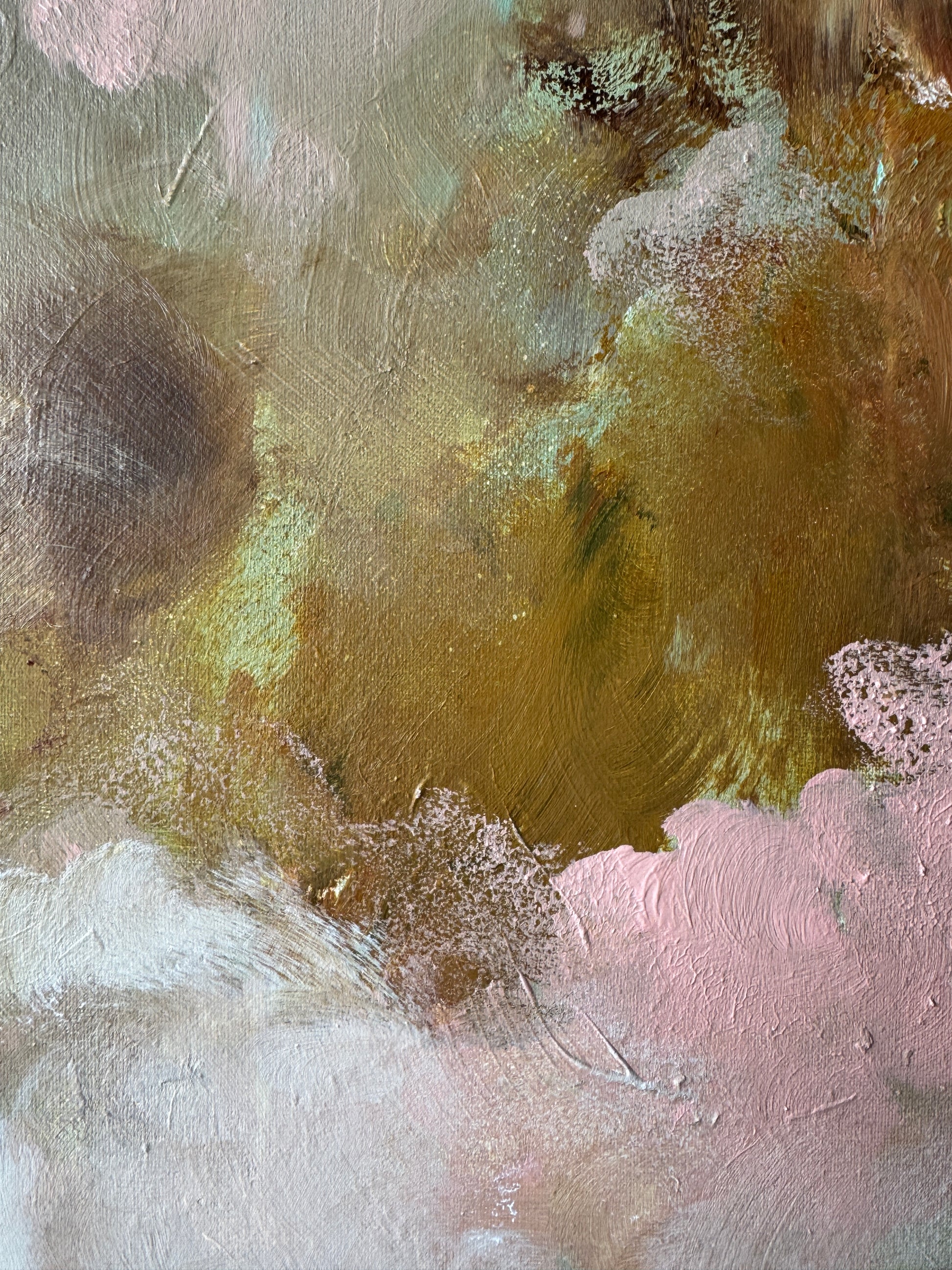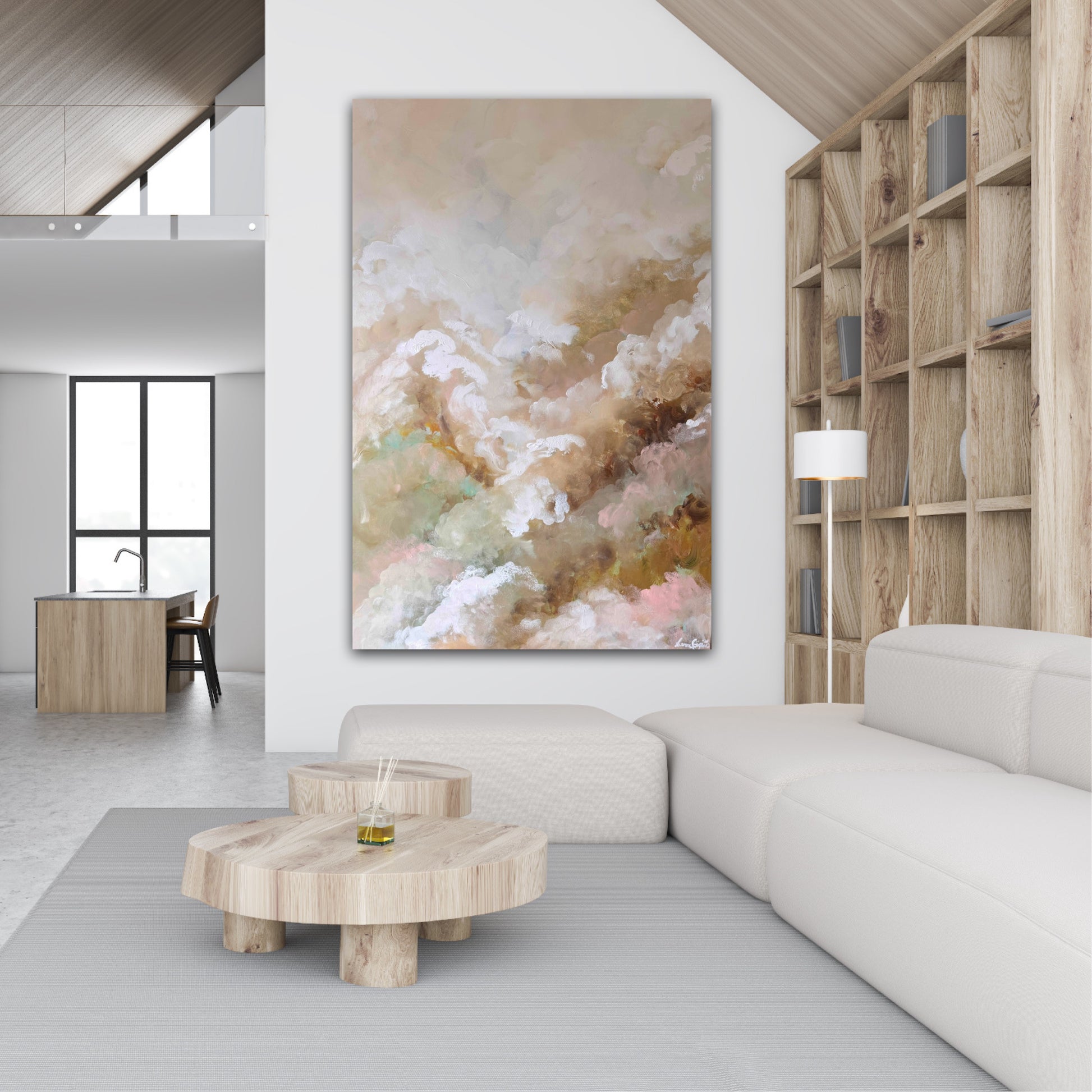 A soft and atmospheric abstract landscape that blends warm earthy tones with delicate pastel highlights. Layers of cloud like texture flows across the canvas, creating a serene sense of depth and movement. This piece brings a calming, dreamy presence to any space.