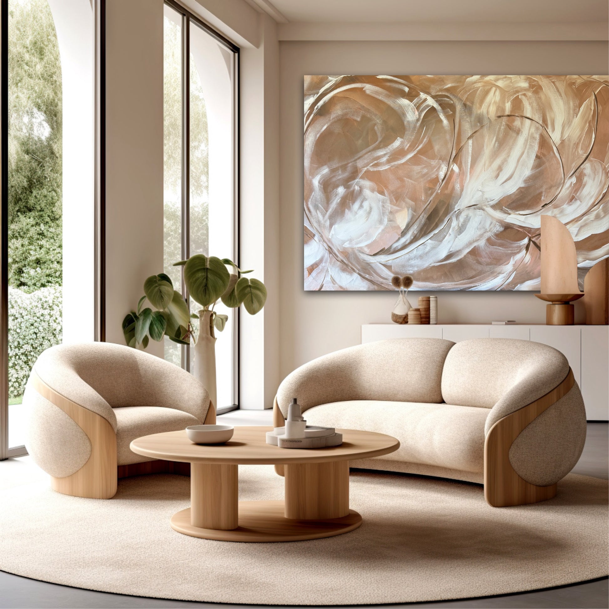 'Sandstone Dreams' brings a sense of warmth and calm through its soft beige, cream and earthy brown tones. Flowing brushstrokes create a sense of movement and depth while the neutral palette makes it a versatile statement piece for any interior. Inspired by gentle textures of nature, this artwork adds elegance and tranquility to both modern and timeless spaces.