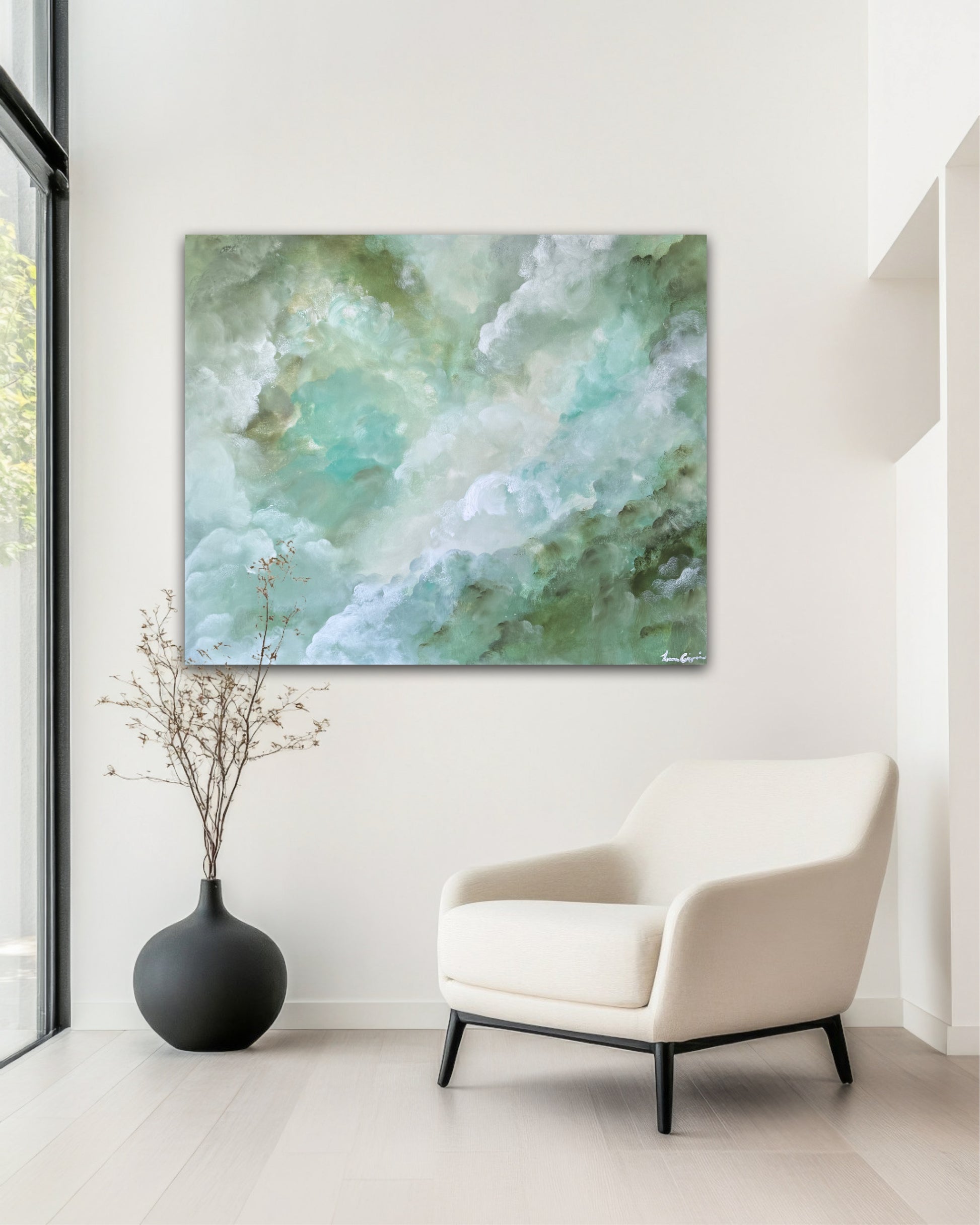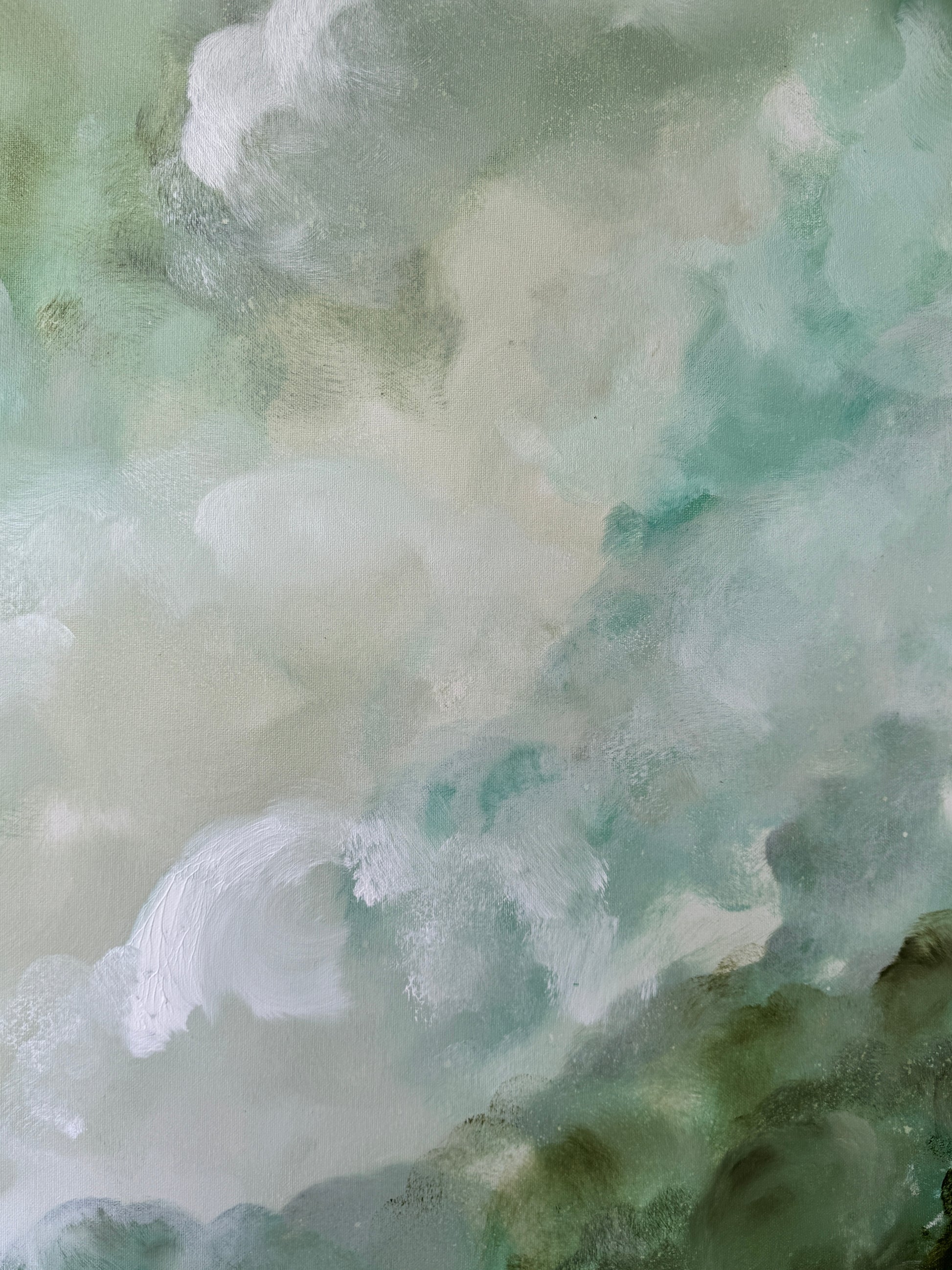 A soft, flowing abstract inspired by nature's quiet moments. Gentle layers of green, aqua and beige move across the canvas like mist over water. Designed to bring balance, light and serenity into a room.