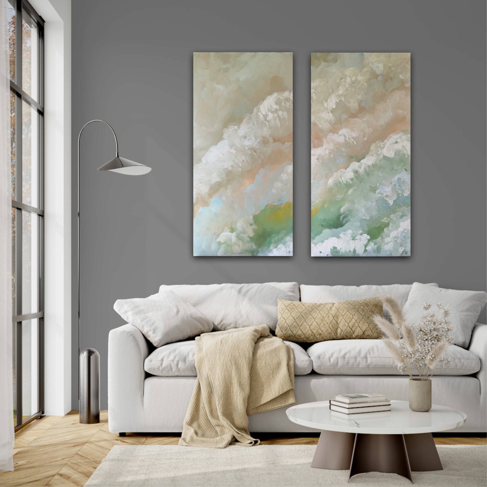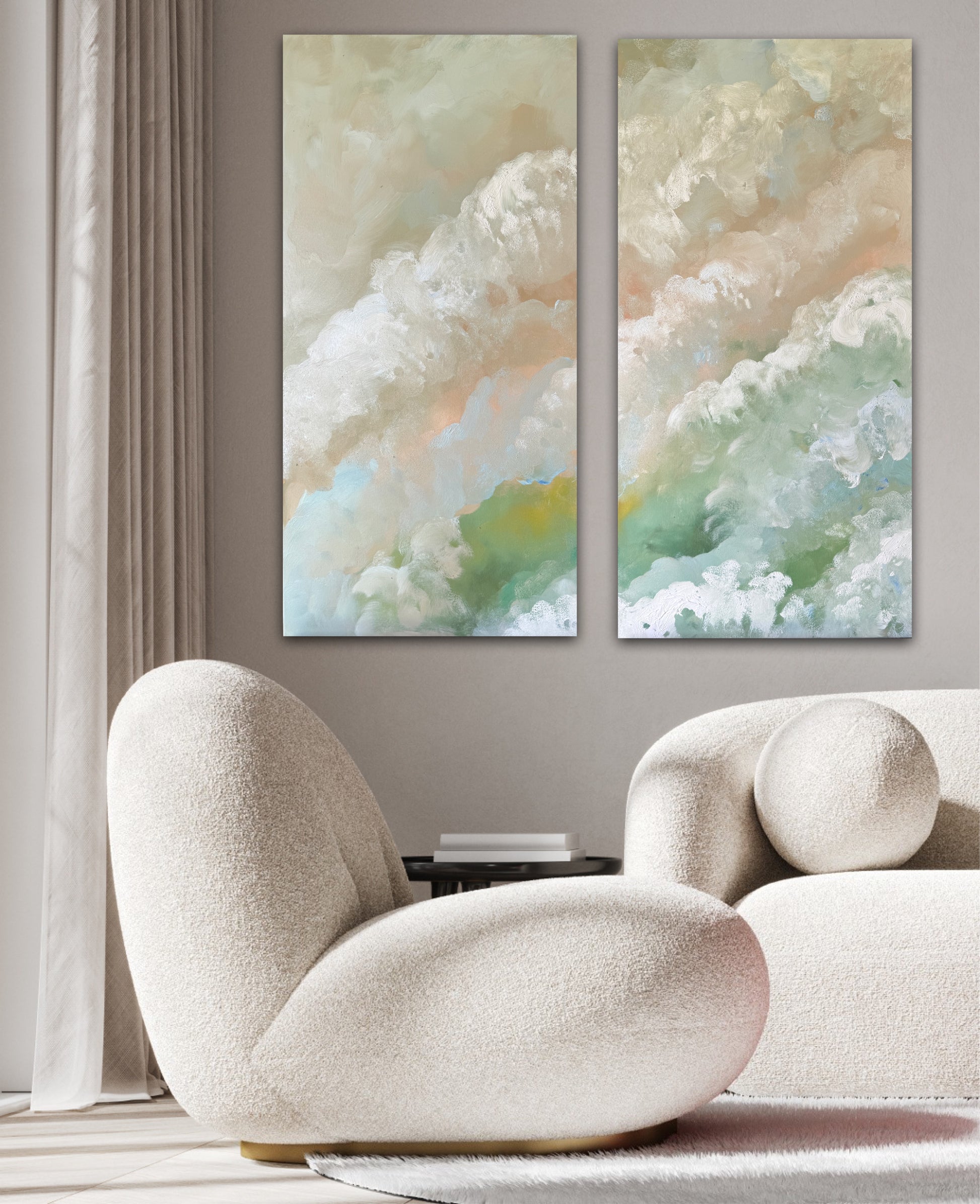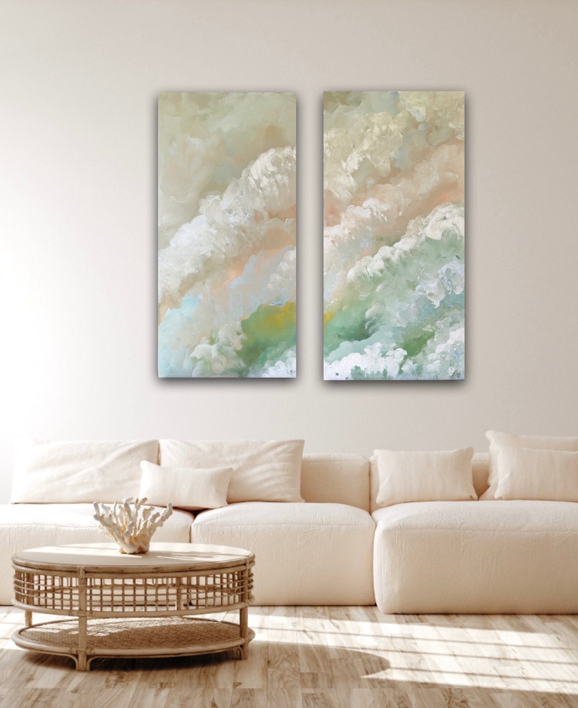 A serene, cloud like diptych that blends soft neutrals with gentle pops of seafoam green, apricot and misty blue. The texture feels airy and organic, almost like watching waves dissolve into the light. This piece adds a dreamy feel to any space.
