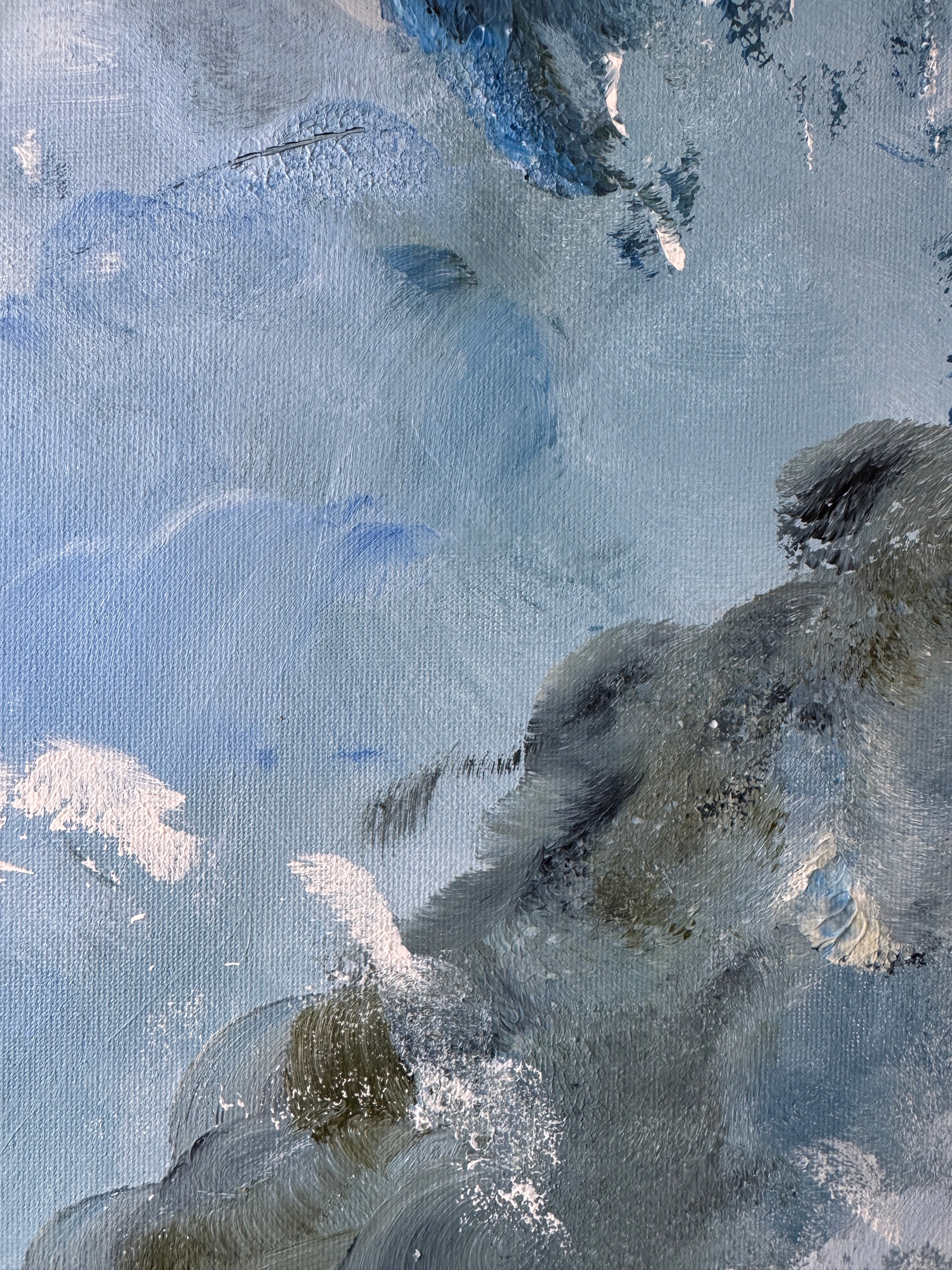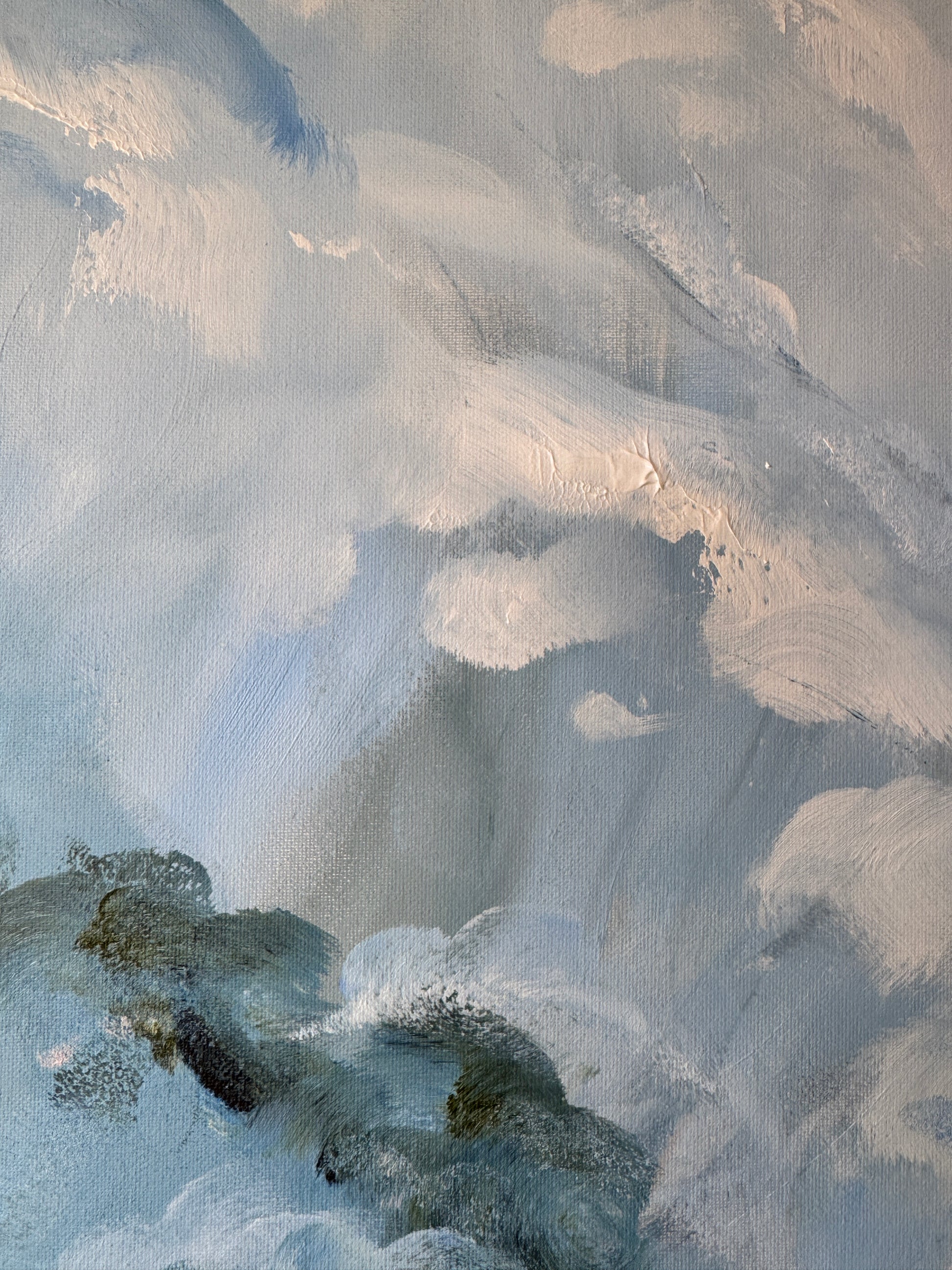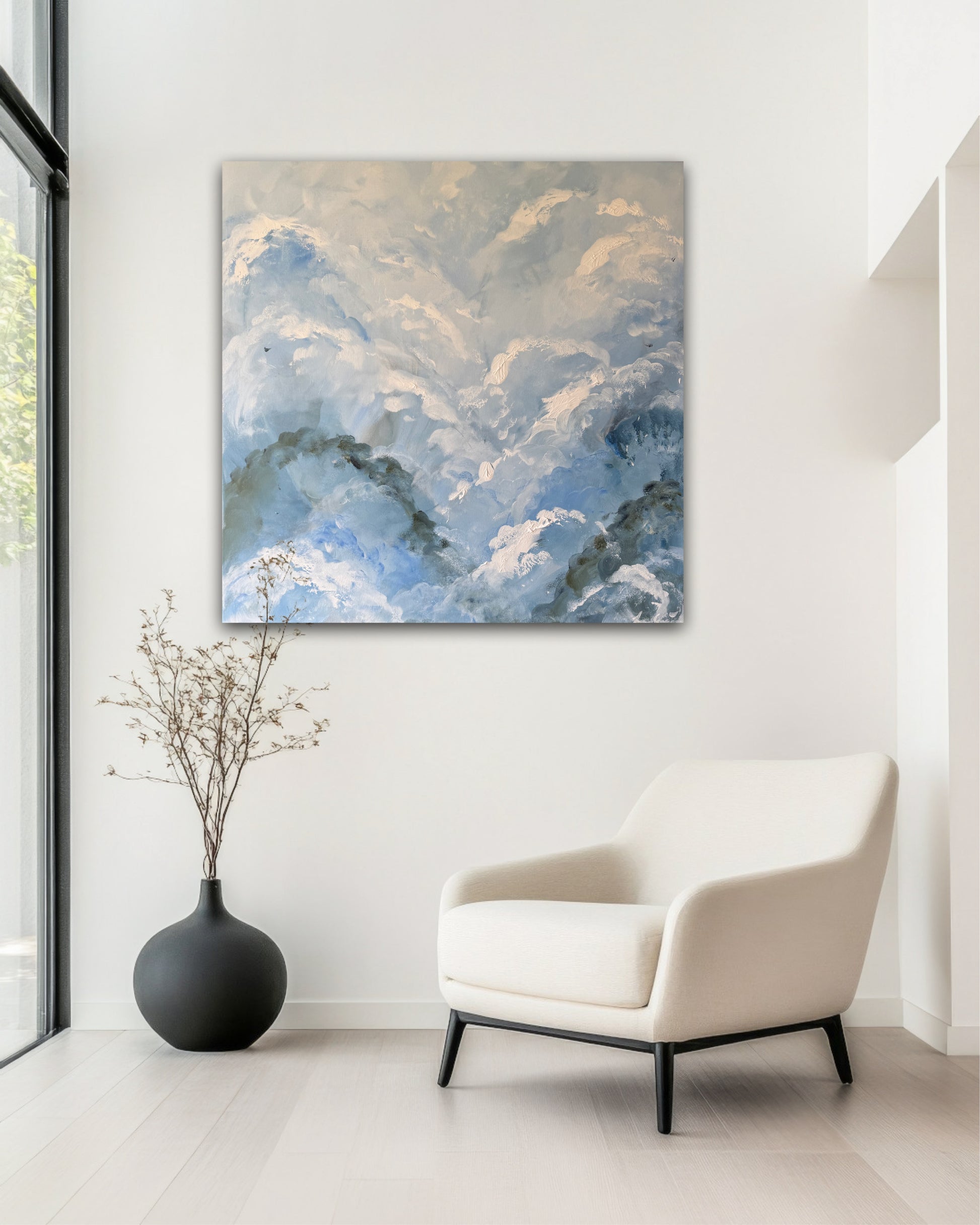 Inspired by the tranquility of the sky meeting the horizon, this piece captures the quiet beauty of clouds rolling over distant peaks. The textured layers and subtle light shifts bring a peaceful and expansive energy to any space.