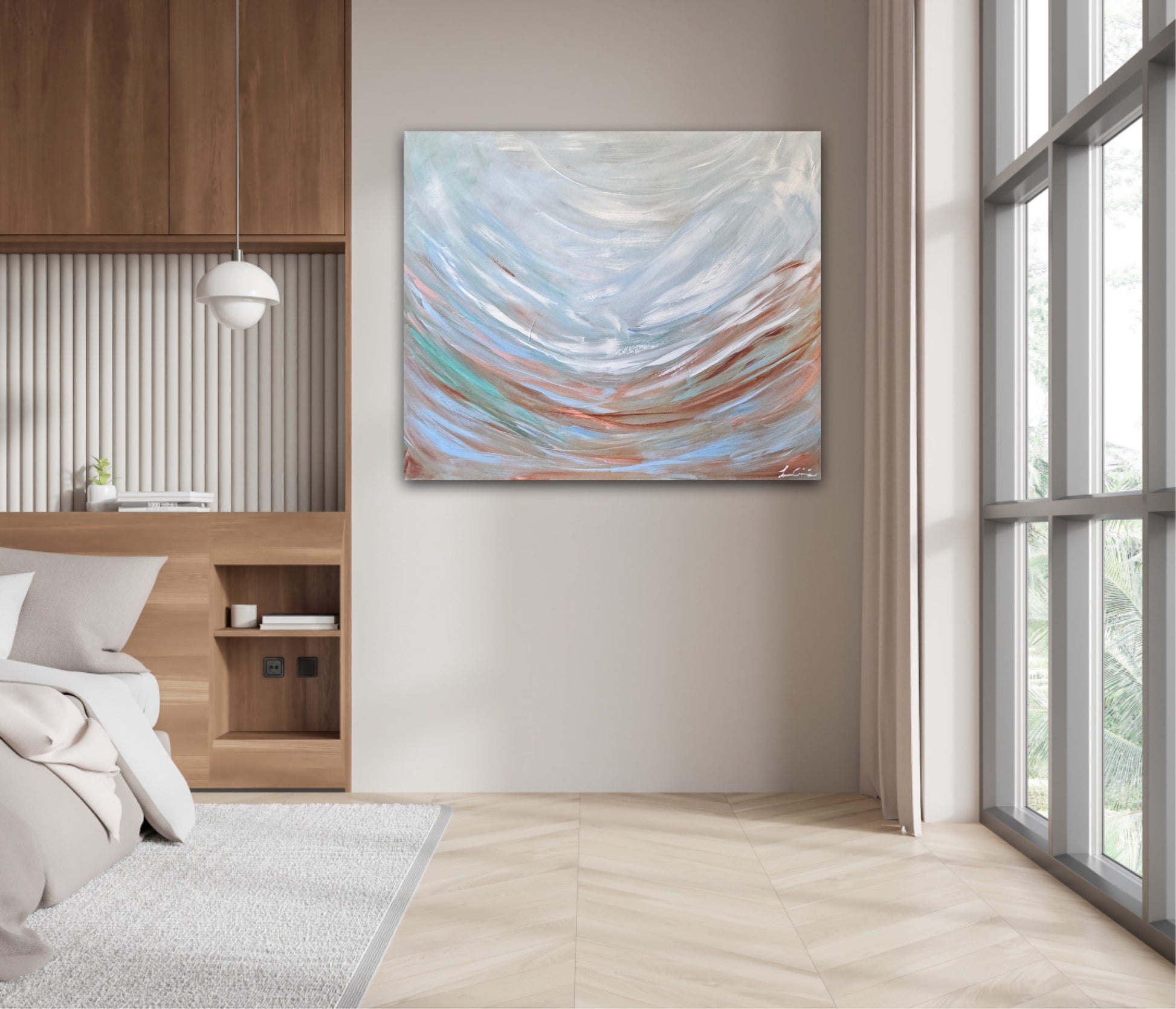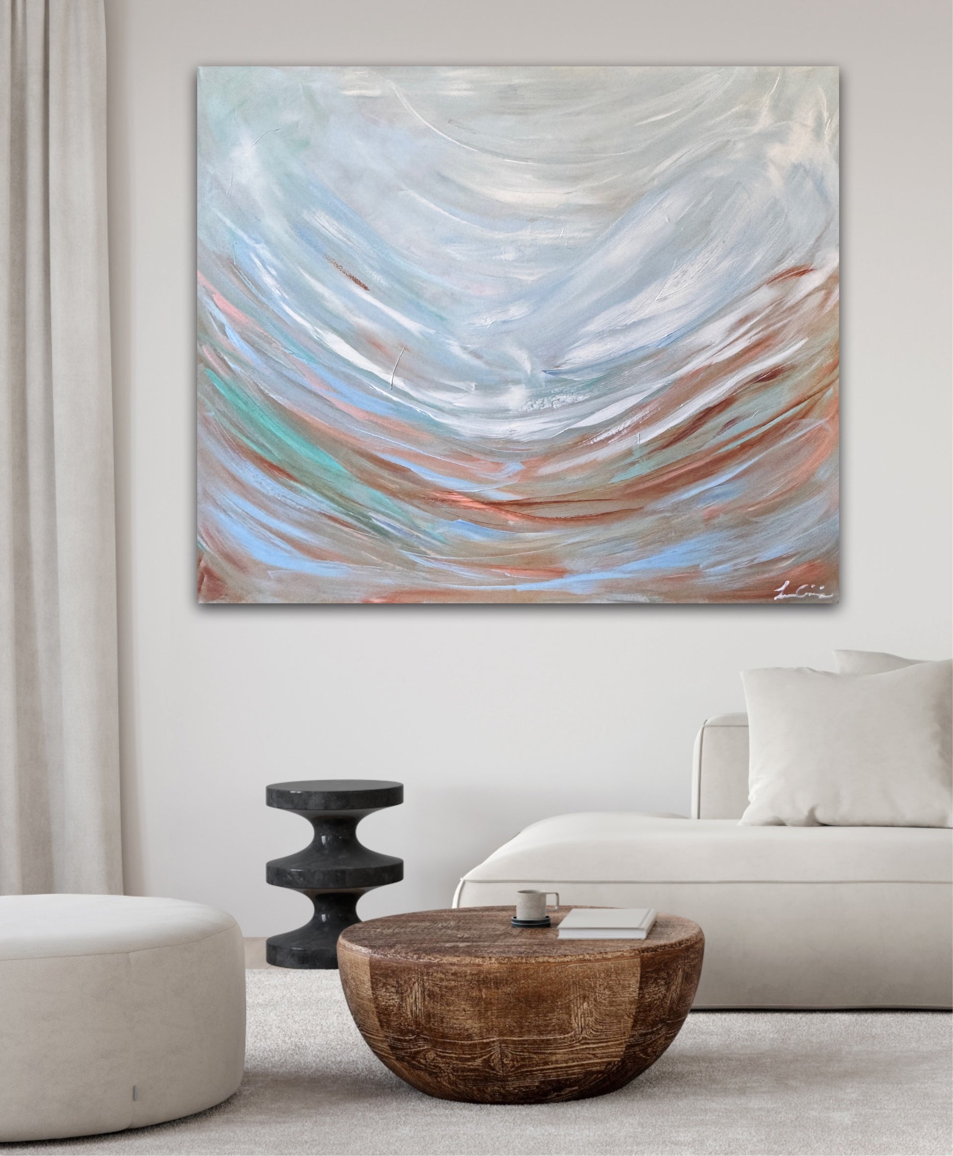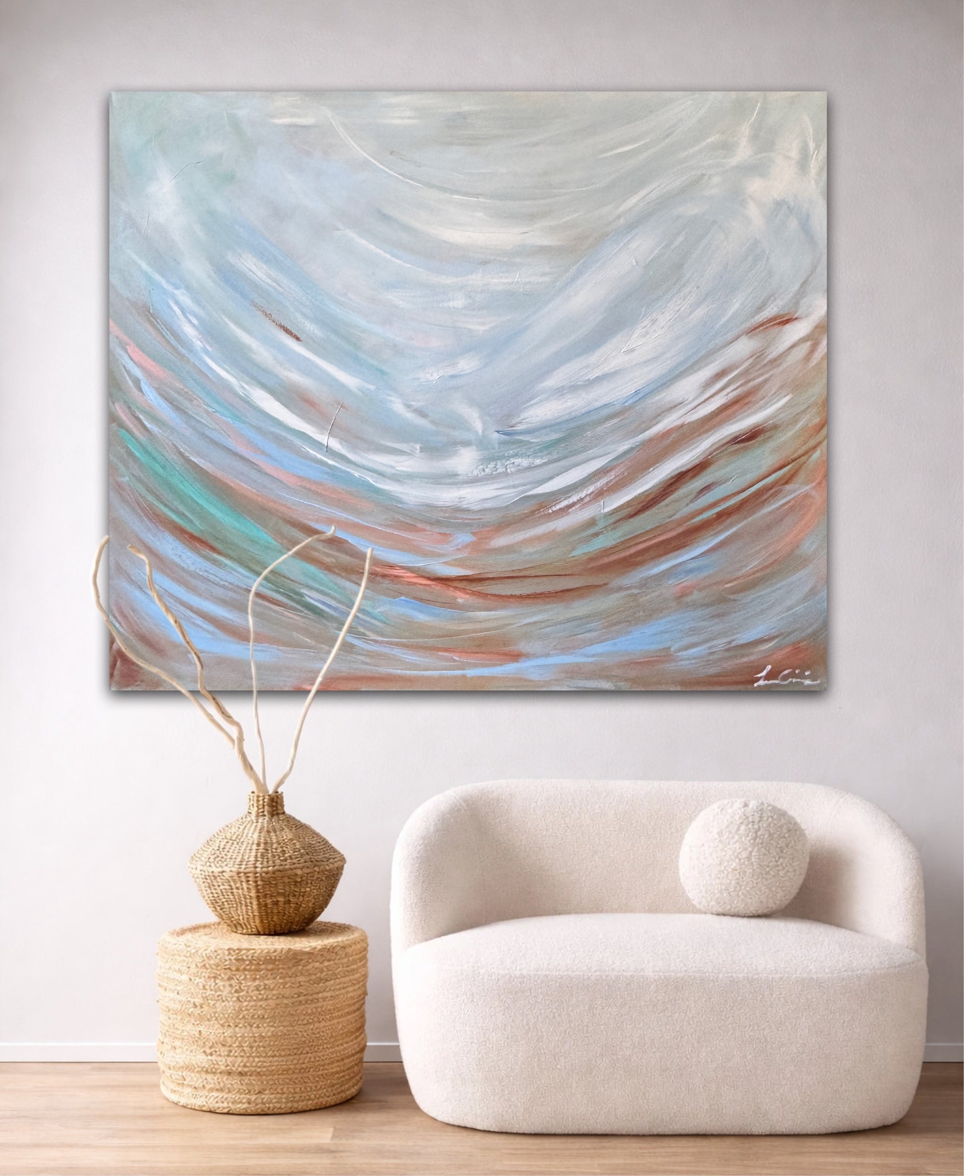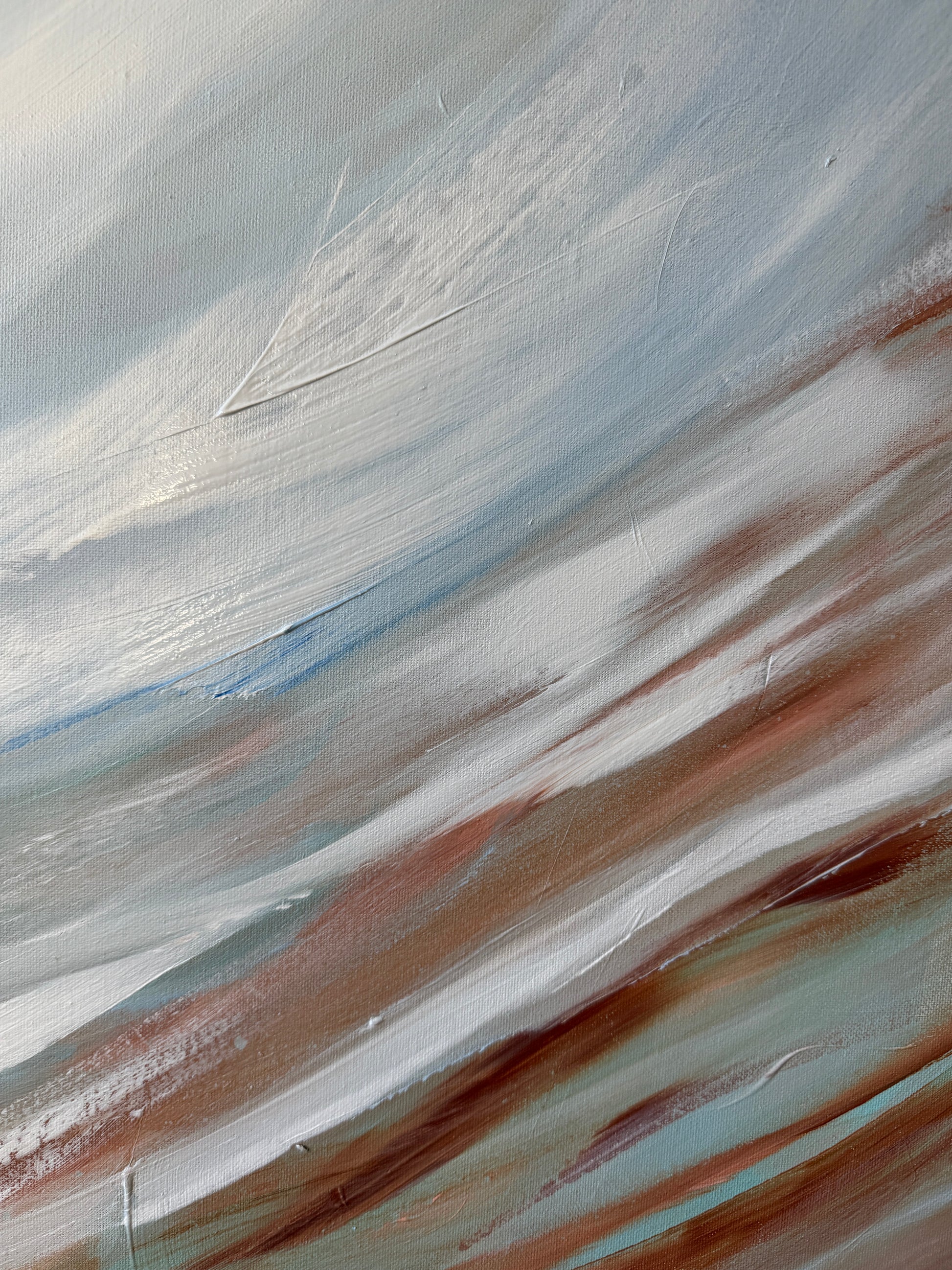 This artwork captures the quiet meeting point between sky and earth. Soft, layered brushstrokes flow gently, blending airy blues with grounded earthy tones. It's a piece that invites stillness and is designed to bring a sense of balance and quiet movement to any space.