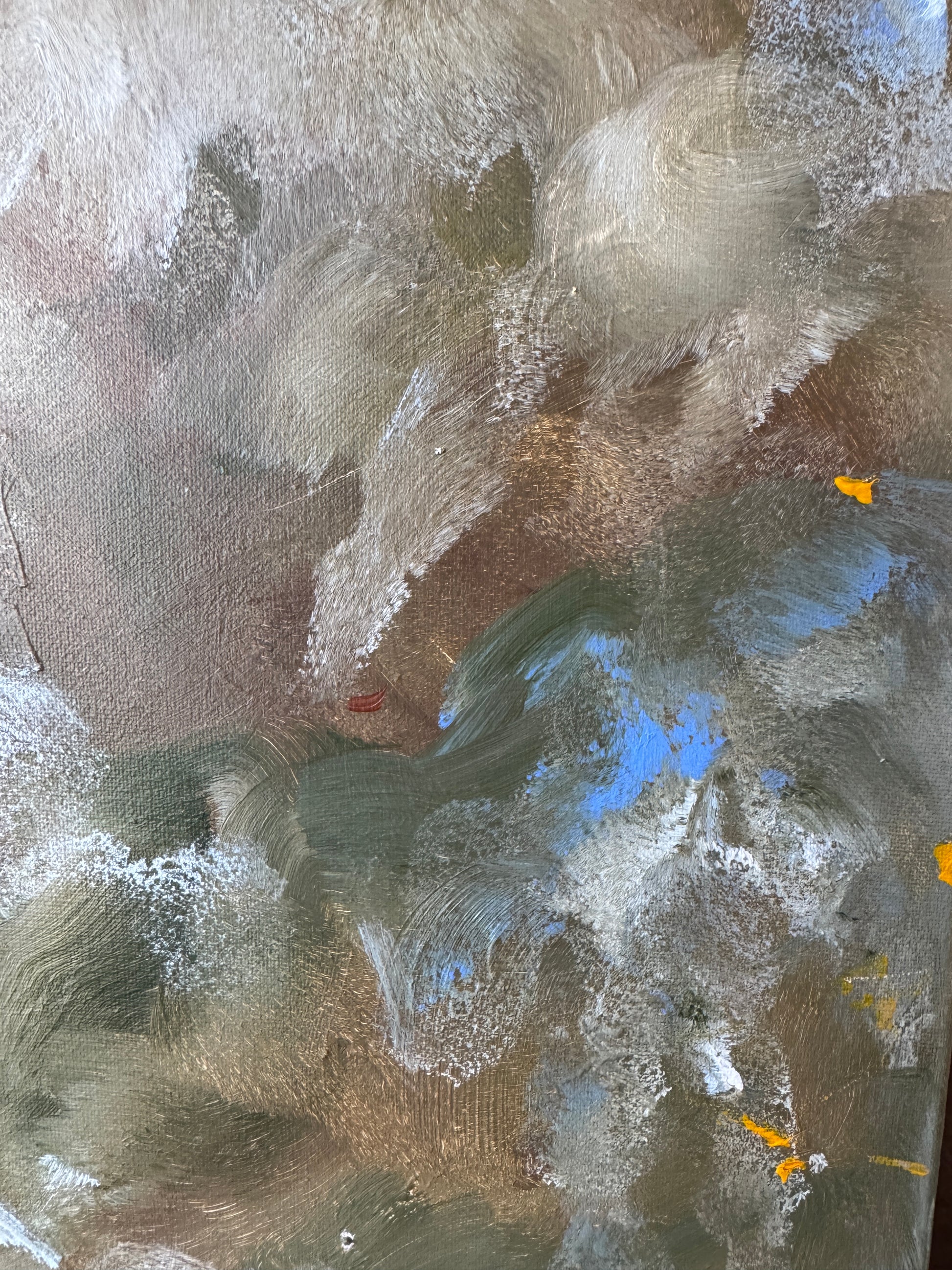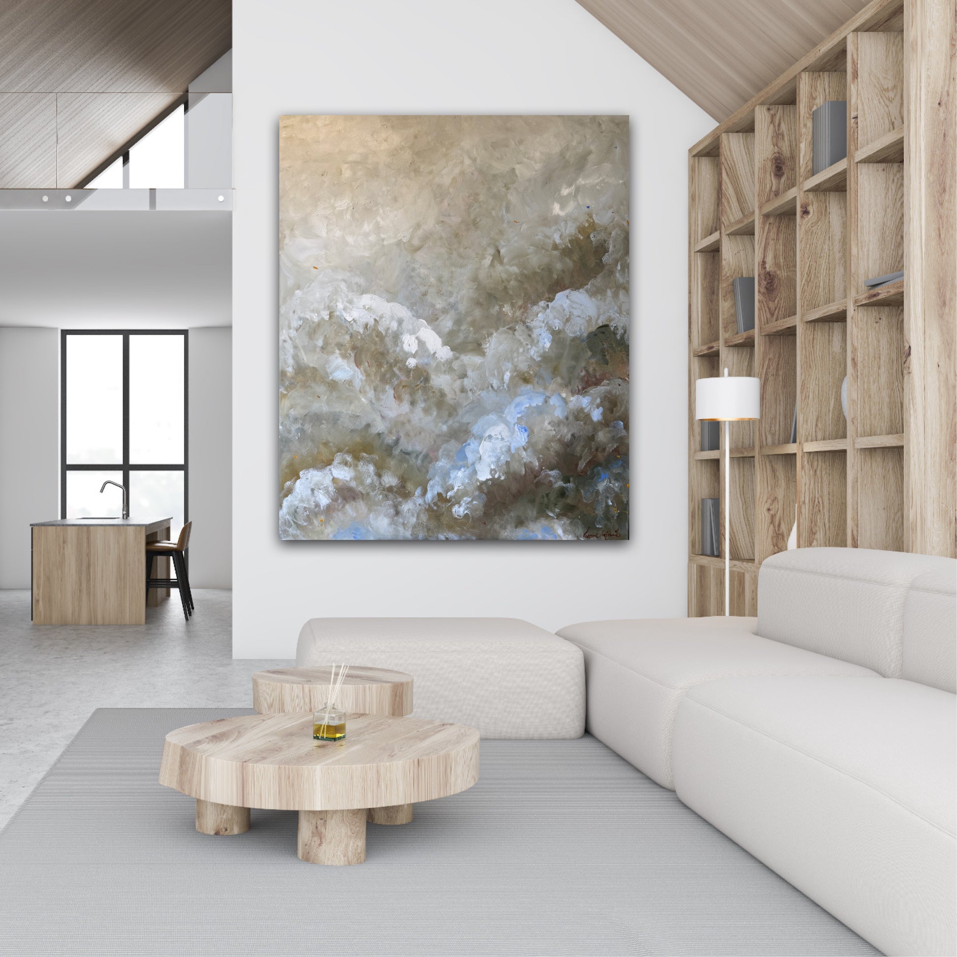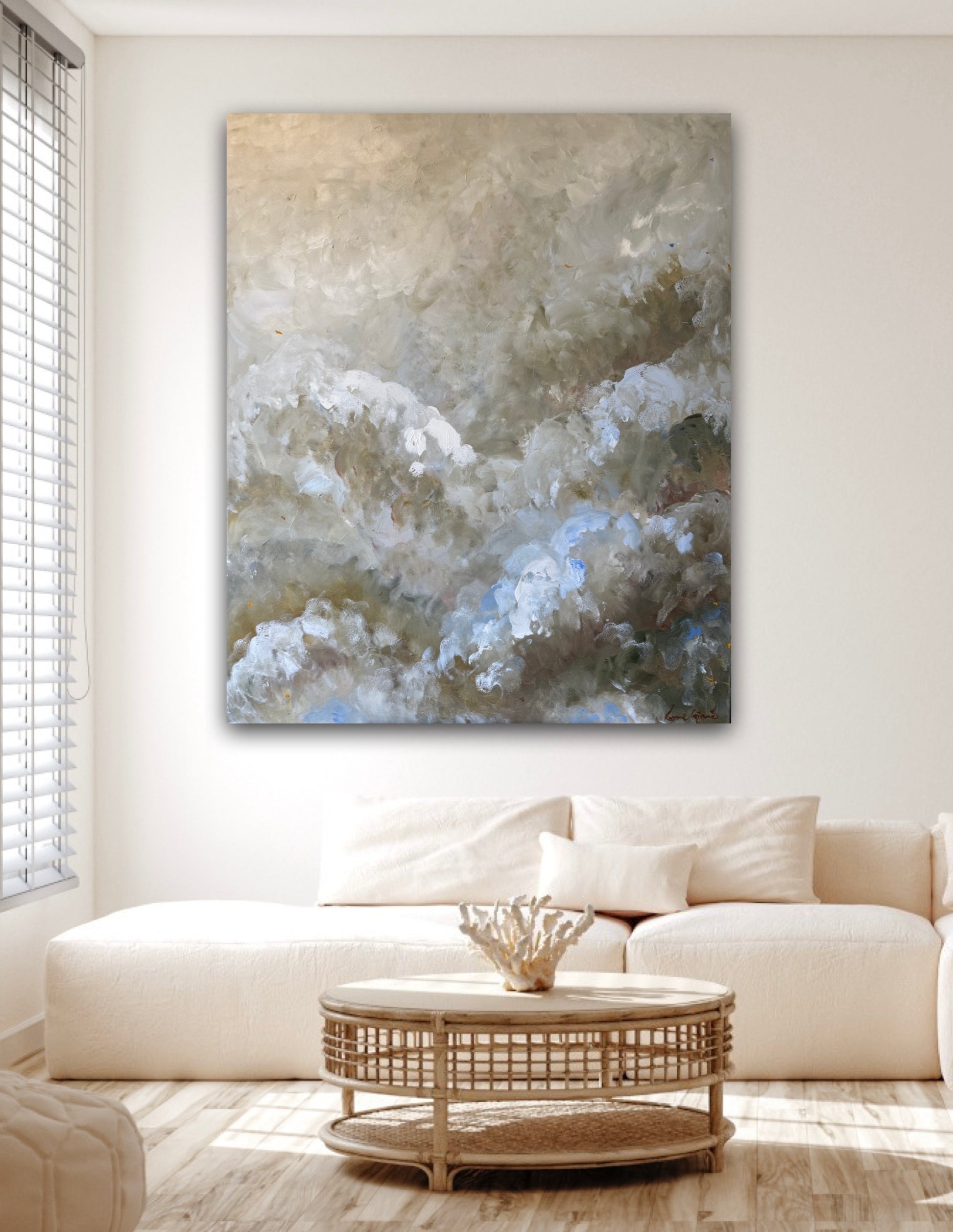 A gentle blend of soft neutrals, cool blues and earthy tones comes together in this serene abstract landscape. Inspired by the quiet movement of clouds and the texture of nature, this artwork evokes a feeling of calm and balance. It brings a sense of light, warmth and natural harmony to any space.