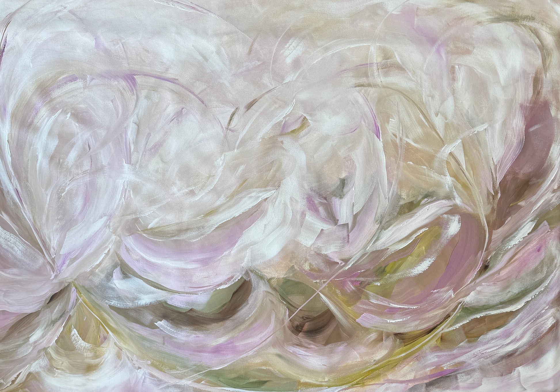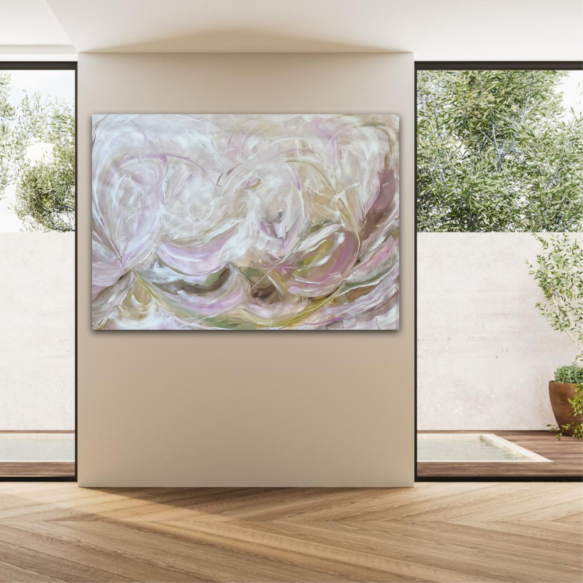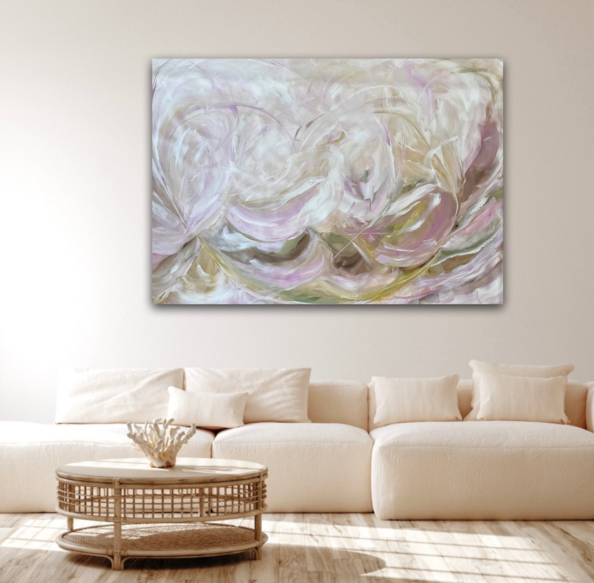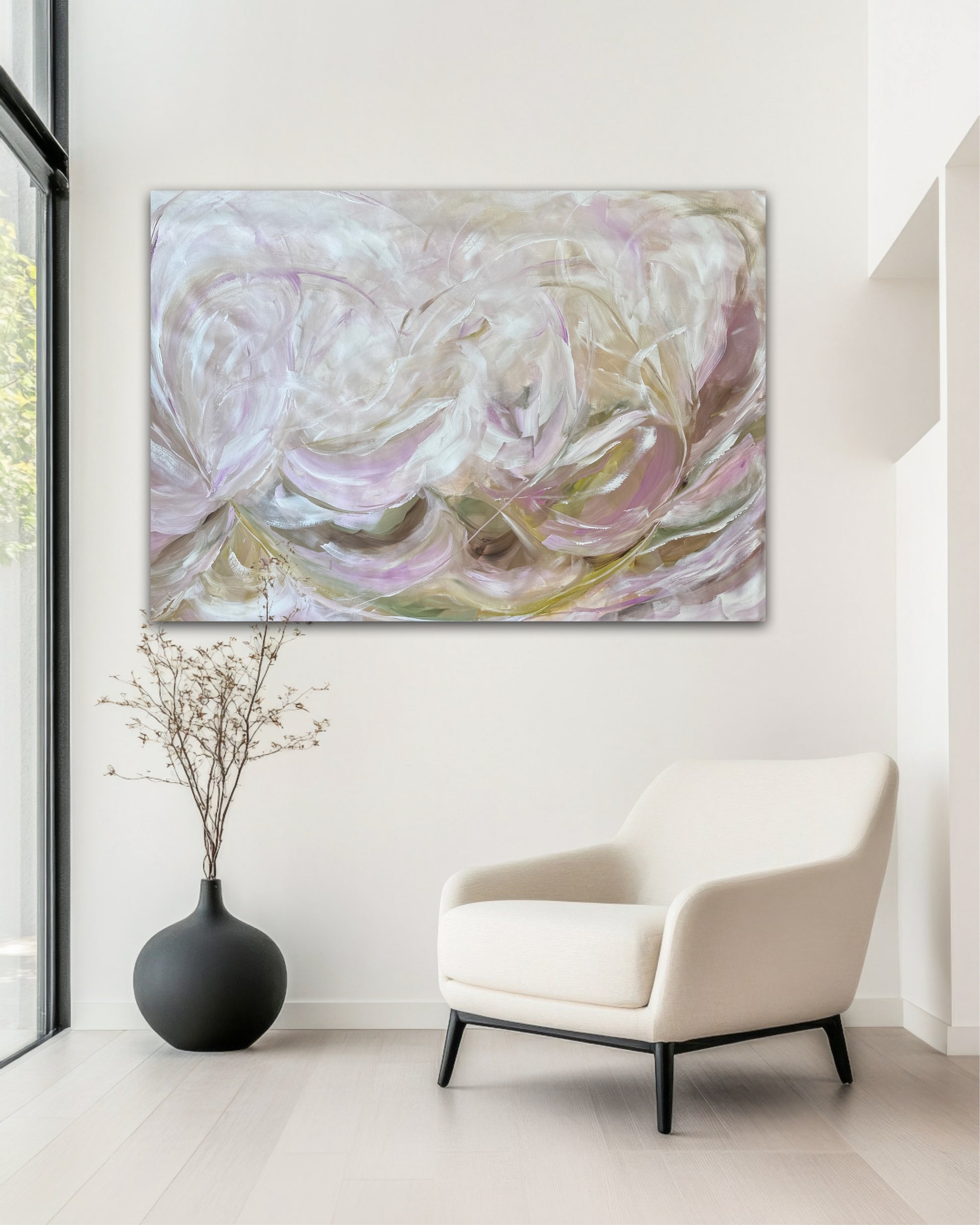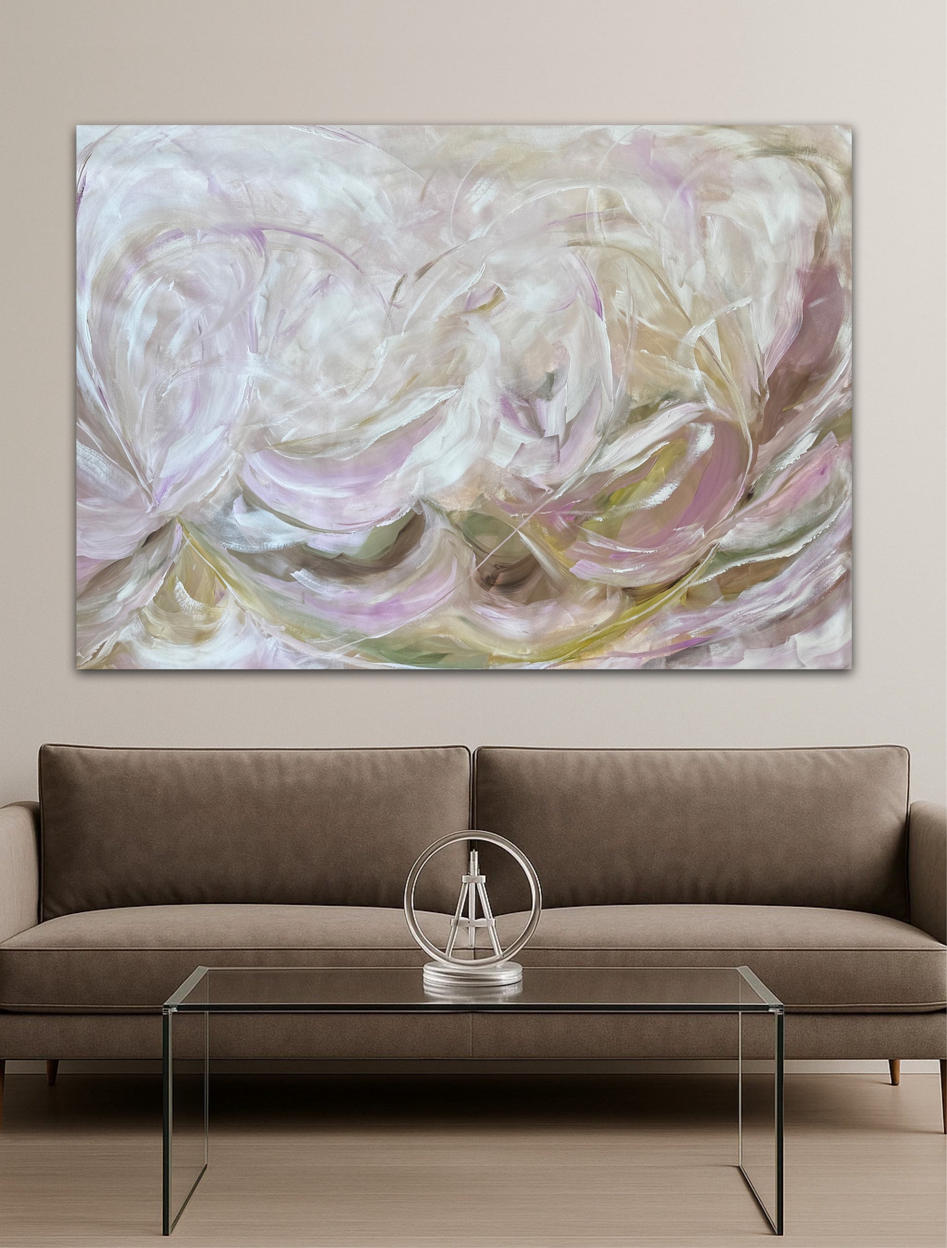 This painting captures a soft, dreamlike atmosphere where delicate pastels drift across the canvas like petals carried by the wind. Perfect for creating serenity in a modern space, it adds warmth, elegance and a touch of ethereal beauty.